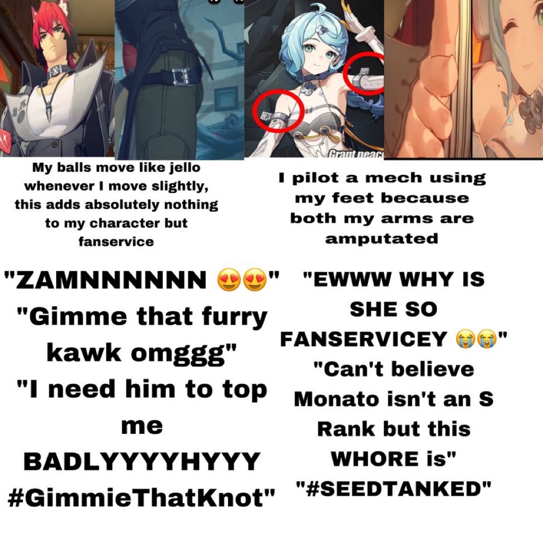 Главная гей-кумерша так у нас вообще, Глиномес, отличный пример лицемерной бляди, которая любит затирать, что фансервис для всех заебись только пока ему тыкают потными сиськами в ебало, стоит увидеть ниприятное, включается защитная реакция "гумер гейм гумер гейм, нада потерпеть, инцелы оплатят".