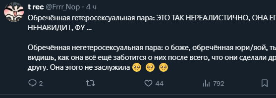 >>5316188 Все же хорошую "пожалейку" сделал Писевор: вроде и много моментов где девочка страдает, и историю её становления/падения показали, а Ровер не ведется и не бежит спасать по первому требованию. Тем ценней каждый шаг навстречу. Трагедия может быть очень красивой.