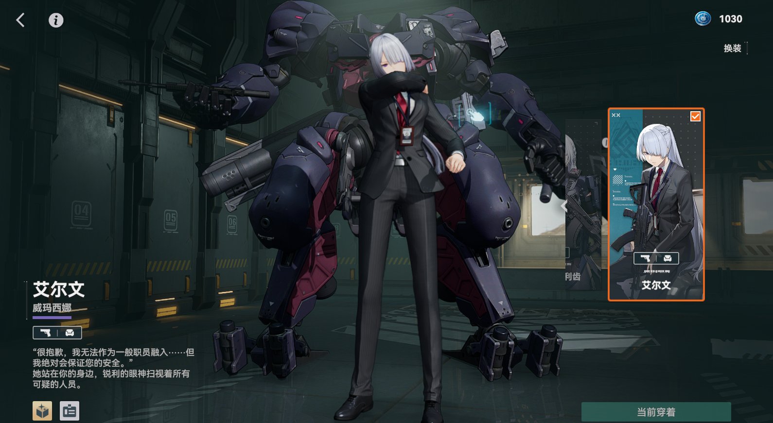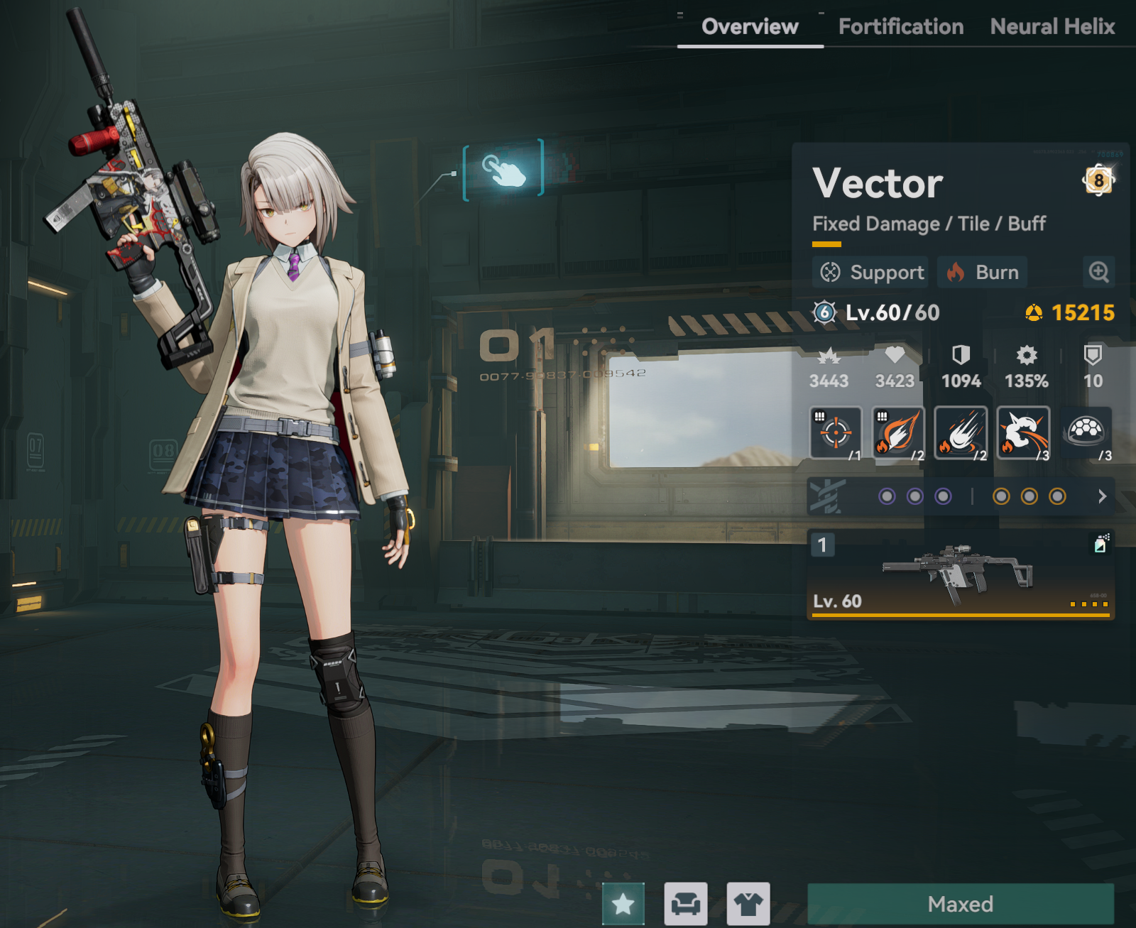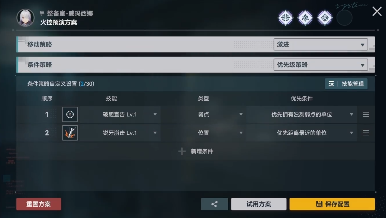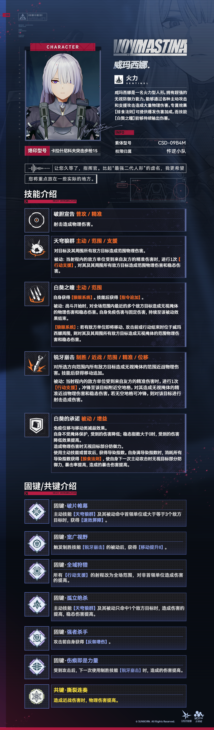Клятва Мастиффа (Пассивный / Положительный эффект) Воймастина невосприимчива к ослаблениям, связанным с перемещением и движением. Воймастина не защищена от снижения урона укрытием, вместо этого входящий урон, который она получает, уменьшается. Когда её устойчивость выше 0, эффект снижения урона усиливается. Когда Воймастина наносит физический урон, определенный процент защиты игнорируется. После использования активных навыков или базовых атак Воймастина получает индекс Конфекционизма. Когда индекс Конфекционизма заполнится, потратьте все очки, чтобы получить [Протокол Хищничества], увеличивающий игнорирование защиты, шанс критического удара и критический урон следующей атаки Воймастина.
