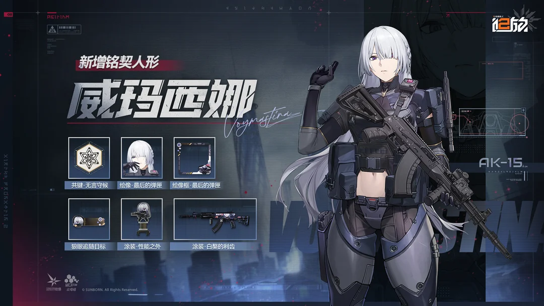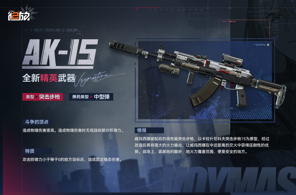 АК-15 - AR - Средний патрон Высокопроизводительная штурмовая винтовка, назначенная на вооружение Воймастиной, созданная по образцу АК-15. Это оружие, модифицированное для повышения производительности, обеспечивает подавляющую огневую мощь, давая Воймастине решающее преимущество в бою на ближней и средней дистанции. На поле боя держитесь за нее поближе, ведь там, где достигает ее огневая мощь, безопасность следует за ней.