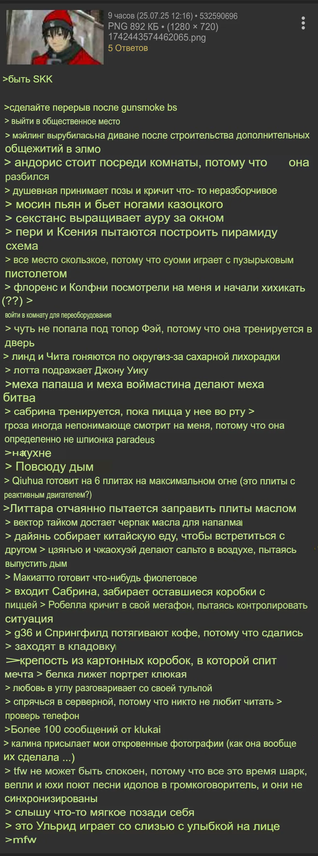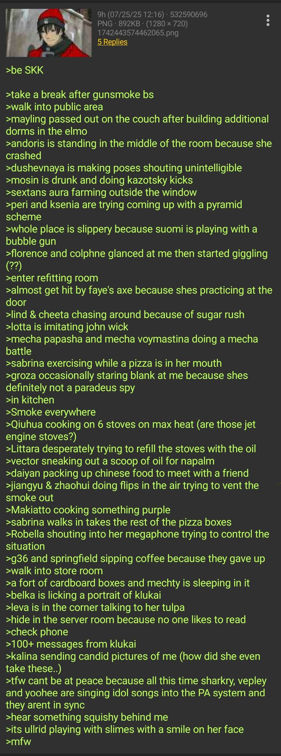 Условно завтра Южонг может сделать кислотный дождь с неба, элидов с коллапсовым рэбом, любую другую агрессивную среду, где куклам нужно больше защиты и огневой мощи. Посадит последних в танки и назовет гфл4: доллззз энд тэнкззз. А Вангарды переделают саундтрек из Мэдмакса. Будет у нас своя Фуриоса для славян-натуралов прямиком из Гипербореи. Не потому что он охуел, а потому что деньги есть и ниша жанра не заполнена.