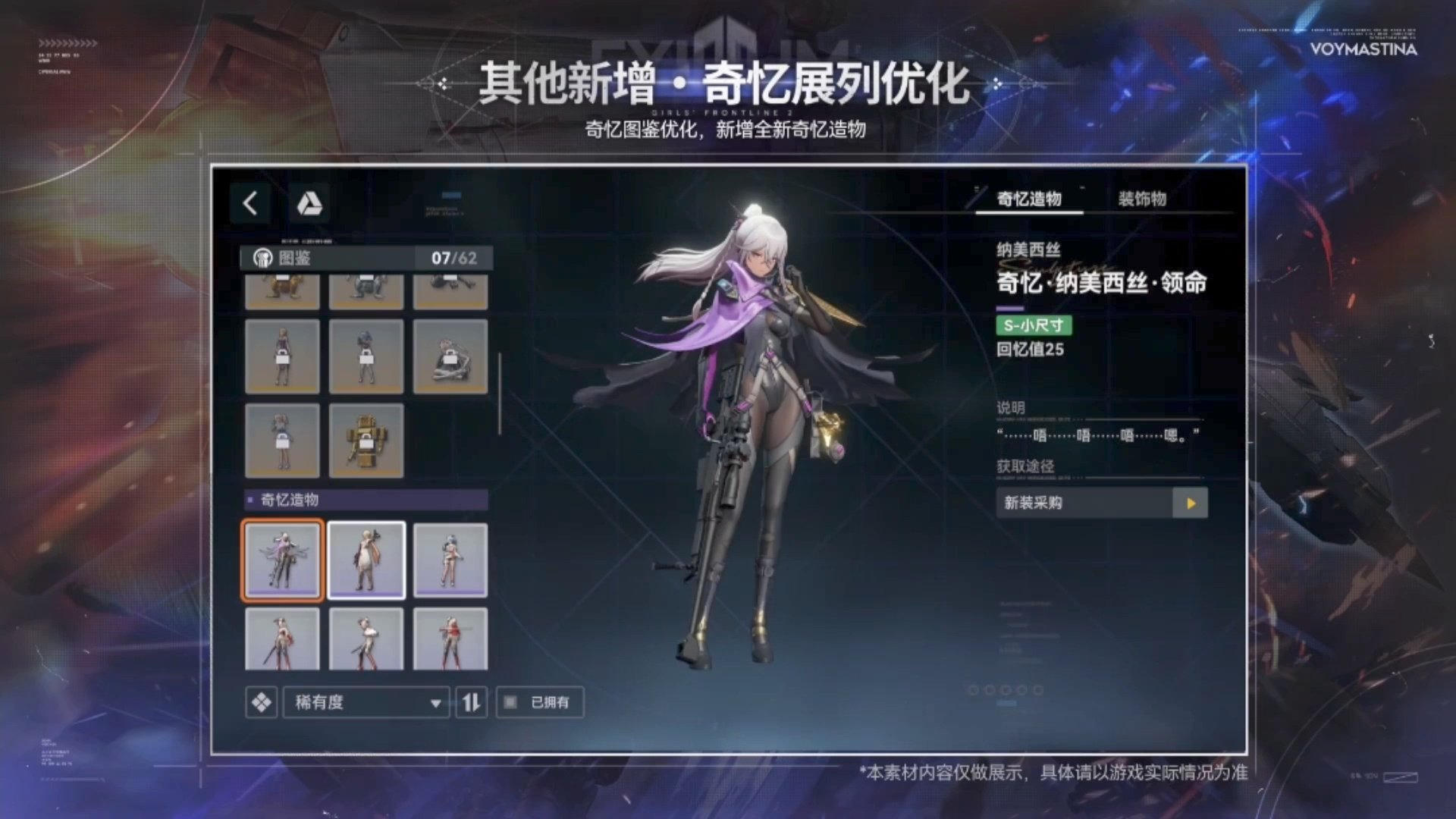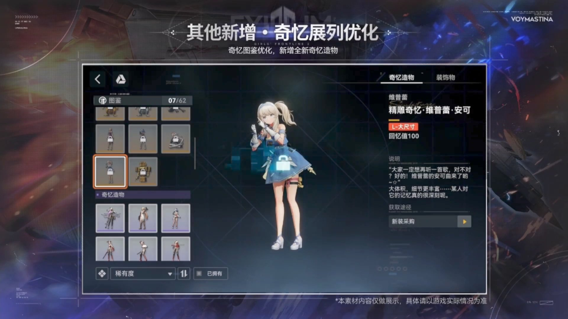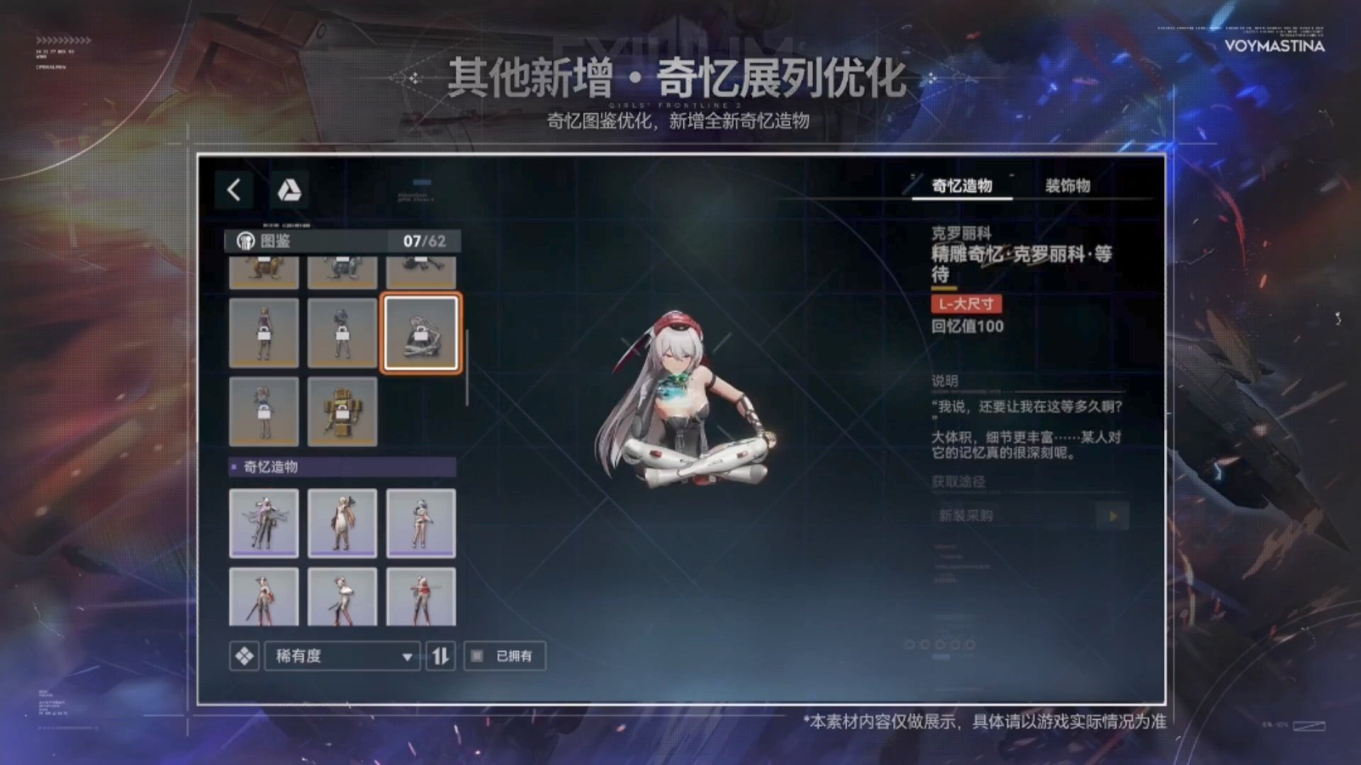 Воймастина — кукла класса «Часовой», специализирующаяся на подавляющей огневой мощи. Она обладает исключительной бронепробиваемостью и способна наносить сокрушительный урон, комбинируя активные и вспомогательные атаки. Ее эффект, [Протокол Хищничества], дает огромный взрывной потенциал, в то время как ее активное умение, [Глаз Мастифа], наносит постоянный урон.