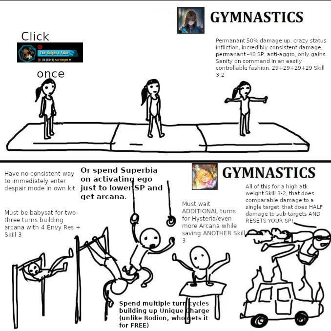 Короче потраил в рр быстренько на первой секции, Родя просто монстр, с с3 выдаёт по 400, бесконечно сидит на -40, сиссинга просто жопой жуй, едиснтвенное с райм шанком не стакается ну вообще никак, у тебя на 2м ходу -30 санити, но и похуй вообщем то. А дон.... Блять, я не знаю что нужно сделать чарджу, чтобы он перестал быть статусом пидором, статусом бесполезностью, статусом боли, в этом мире победившего статус эффекта. Ну и иди, которой чтобы начать играть нужно 3жды(!!!) срезанировать сука 4(!!!!!!!) энви в чардж(!!!!!!!!!!!!!) просто нахуй идёт. Про то что родя с одного диспеера получает +% к урону больше, чем донкихот со всех своих пассивок и кондишенов я промолчу.