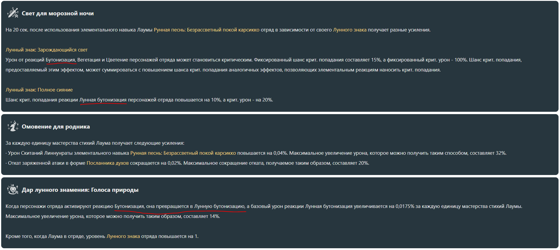 >>5340059 Есть формула с хомдкэт, там пишут, что лунная бутонизация - это чисто урон какого-то скилла Лаумы, а остальные бутоны просто получают баф с ее скилла. Это рили так работает?