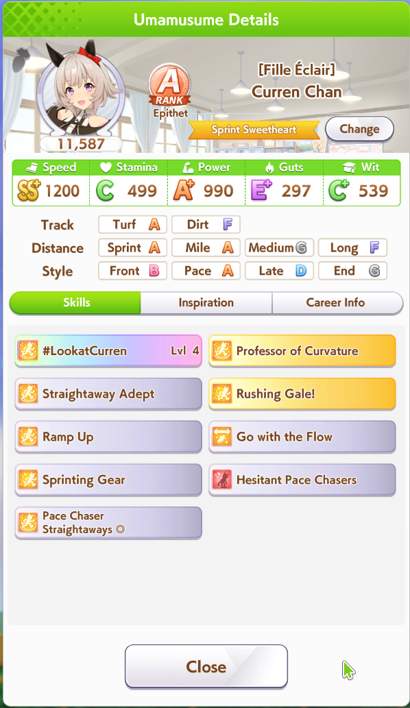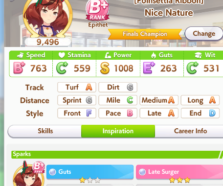 >>5350780 Можно чисто спринтера. В её карьере нужно только Скорость и Повер качать. Мудрость ты перекачал. Спид не докачал. Можешь ещё предками ей Пэйсера до А поднять, чтобы она ближе к передним рядам бежала в гонке и ей не нужно было с задних рядом в спринте обгонять всю толпу.