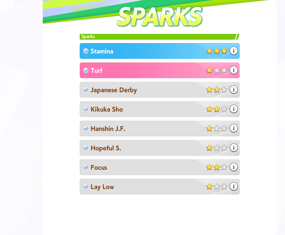 Wit Fine Motion > Mr. C.B. 9 november 2022 > Mejiro Ramonu 24 february 2023 > Daiwa Scarlet 29 october 2024 Stamina Super Creek > Sounds of Earth 20 november 2023 > Air Shakur 29 october 2024 Guts Ines Fujin > K.S.Miracle 30 january 2023 > Orfevre 24 february 2024 Speed Kitasan > Maruzensky 29 july 2022 > Agnes Tachyon 24 august 2022 > Jungle Pocket 19 may 2023 > El Condor Pasa 23 august 2023(OP) > Still in Love 24 august 2024