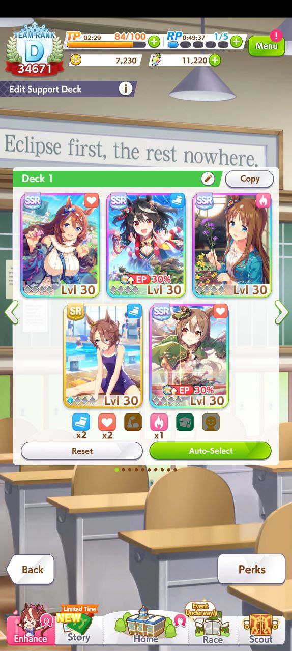 Попробовал по гайду из шапки сыграть за Водку, ибо на моем акке она пока единственная с B рейтингом, но тонной бесполезных скилов. Вылетел на 4 гонке, хотя все делал по гайду: собрал 3 скорости 2 стамины 1 павер, постоянно пикал радужки в тренировках. Сейчас прохожу забег с другой колодой - 2/2/2 скорости стамины павера, и у меня вопрос - почему в гайдах постоянно указывают сборки с перекосом в скорость/стамину, если это просто не работает? Не лучше ли сбалансированную колоду собрать?
