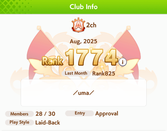 У нас есть два клуба: 2ch и 2ch^2. В первом залетевшие пораньше и потничи, во втором - преимущественно подпивасы. Чтобы вступить в клуб - напишите в описании своего профиля в игре тег треда или что-нибудь на кириллице. Если в первом клубе нет мест, то пишите в тред свой UID, чтобы админ кикнул рандома или инактив и отправил вам инвайт. Во втором треде 1-2 слота, обычно, всегда есть.