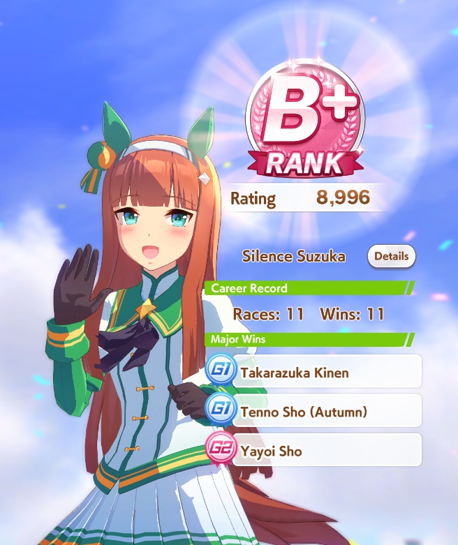 По ощущениям спида можно было и больше вкачать, намерено пропустил как минимум две радужные тренировки на 20-30 очков, где-то с середины карьеры началось просто дичайшее проседание по стамине, всё боялся что её не хватит и останусь у разбитого корыта, приходилось жать на свои +13 на тренировке. Приходилось практически одну стамину тренировать и всё-равно отставание не покрылось нормально. Ну и карьера у неё немножко дебильная, как уже упоминали, чистого спринтера не построить на ней, спасибо хоть Ариму бежать и побеждать не заставляют еще.