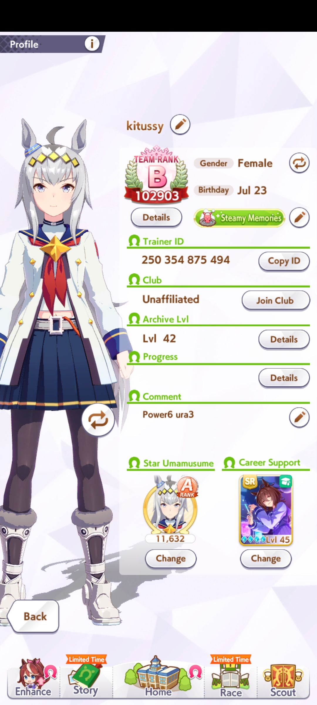 Кто-то сталкивался с тем, что с мобильного интернета игра не работает? Просто не грузит и выдают ошибку. Причем такое только три дня. В выходные еще спокойно шпилил по лте , сейчас ВСЁ. Алсо, помогите ньюфагу понять с чего начать. У меня тима вся зеленая с С рейтингом. Пока играю исключительно в курьеру. Но закончил успешно только один раз за все время за водку. И то потому что ее имбовый скил постоянно прокал. В гайдах пишут типа надо например иметь 1200 скорости к концу карьеры а я еле добираю до 500-600. Что я делаю не так? Я крайне редко отдыхаю когда в пол только энергия падает. Чередую основной стат и вит, чтобы отдыхать через вит.карты ставлю нужные по найду и легаси. Радужные ивенты с друзьями из КБ которые сильный прирост дают. Звезды открываю потенциал увеличиваю кобылам. Что еще делать та а?