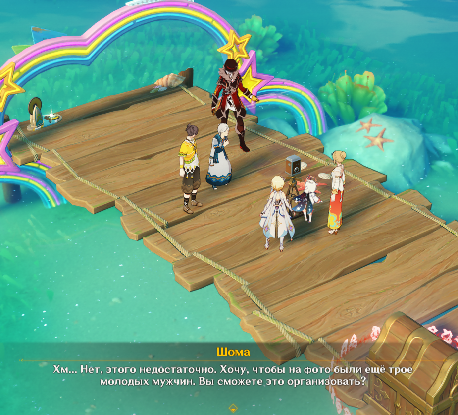если найдете чела который говорит что босс продаёт несвежую рыбу то не повторяйте моих ошибок скажите боссу что рыба свежая и тогда кроме рецепта от босса можно получить 10к моры (очень важно для экономики аккаунта) у рабочего