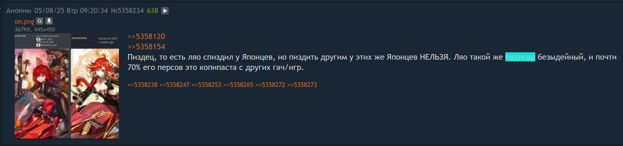 >>5358319 Ляо как раз таки изучал эти самые помойки, ибо спиздить там куда легче, чем придумать свое. Ляо этим не брезгает уже не первый год. Чего стоит трейлеры в ХСР, которые были спизжены в конкурентов в лице NetEase. Или спизженый в ХИ3 трейлеры из Фрирен.