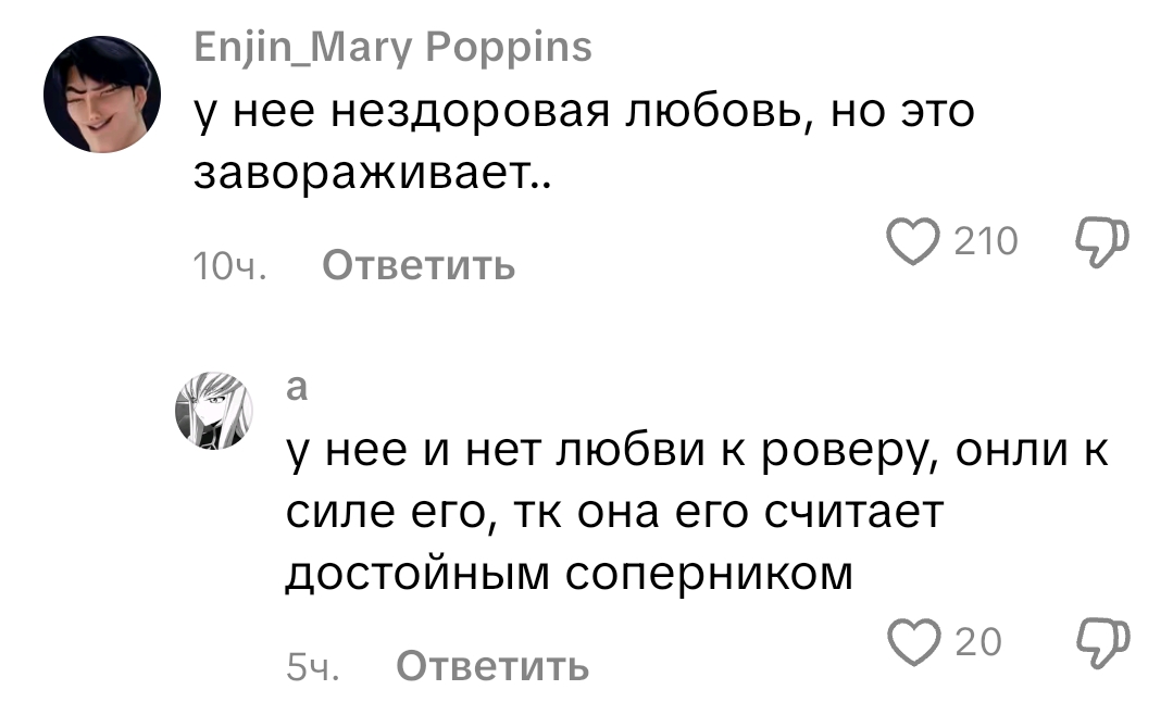 То, что часть аудитории это кумеры, которые просто хотят сиськи-письки, а другая игнорирует неудобное и коупит тем, что Фролова ненавидит Ровера, никак не отменяет того, что настолько ебанутую одержимость Ровером (которая, опять же, прошла проверку временем) испытывают в вуве единицы.