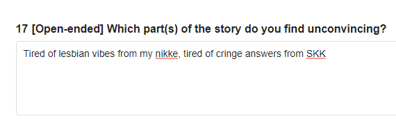 Вообще, прикрутить бы уже нейросетку к игре, что ли. Чтобы можно было отвечать жопкам то, что хочешь, как в настоящей ролевой игре. А они уже согласно своему характеру повеления, знаниям и лору, отвечали соответствующе. Вышло всяко бы не хуже потужных диалогов штатного писаки. Я видел подобную симуляцию в Морровинд и это довольно впечатляюще. Может новая гача будет такой. У каждого свой уникальный экспириенс. Но тогда вряд ли игра будет бесплатной.