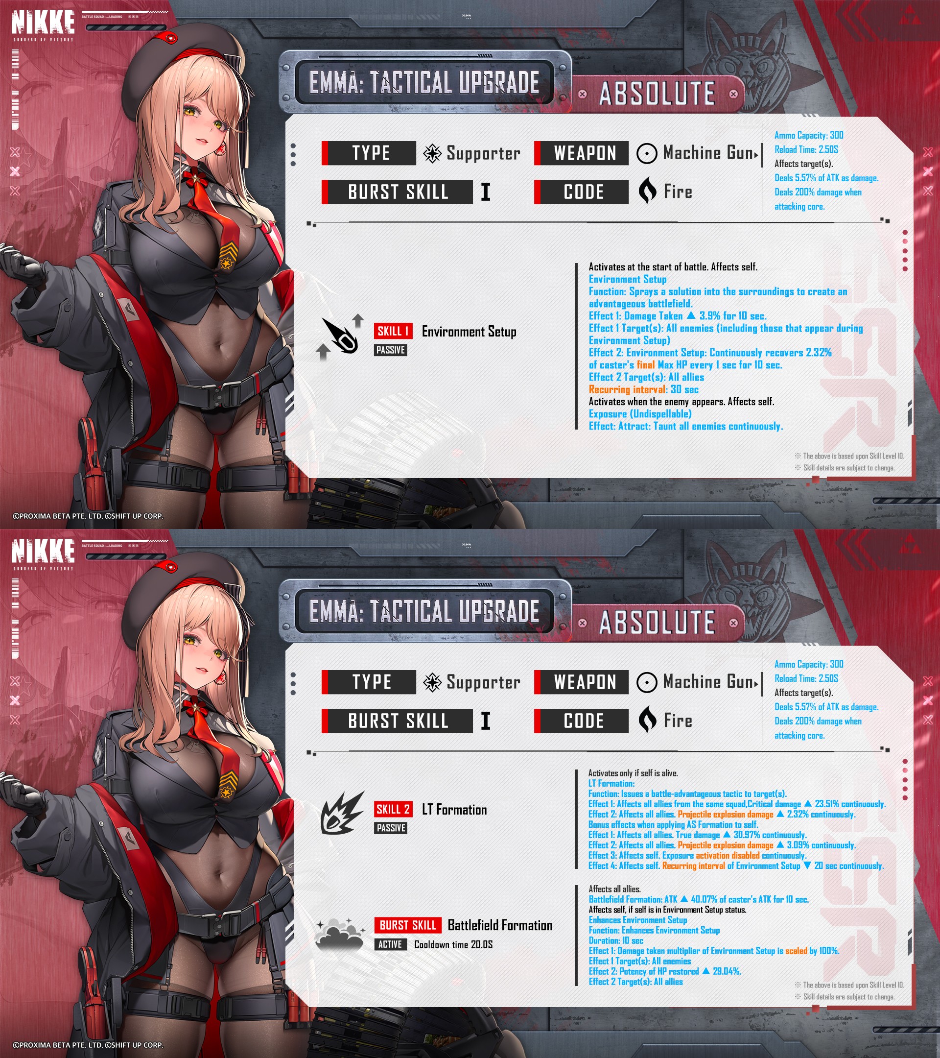 1. New Character 1.1 SSR Emma: Tactical Upgrade SSR Emma: Tactical Upgrade, the gentle big sister of the Absolute squad that's made stronger through the Tactical Upgrade Plan, joins the battlefield. Emma: Tactical Upgrade is a Supporter who supports her allies' survivability and enhances their attacking capabilities. Depending on the formation, she further amplifies their attack power, prolonging the favorable situation for the allies. - Class: Supporter - Weapon: Special Therapy T (MG) - Code: Fire - Manufacturer: Elysion Special Recruit duration: From the end of the August 7, 2025 maintenance to 4:59:59, September 4, 2025 (UTC+9) In the version update after Special Recruit ends, Emma: Tactical Upgrade will be available in Ordinary Recruit, Social Point Recruit, and from Mold items. (Unavailable in New Commander Special Recruit, Ordinary Recruit (Tutorial), and Mileage Shop)