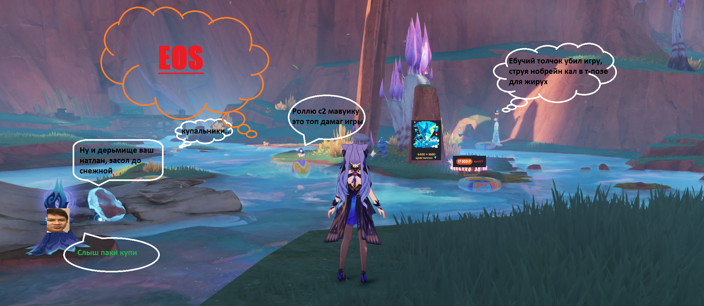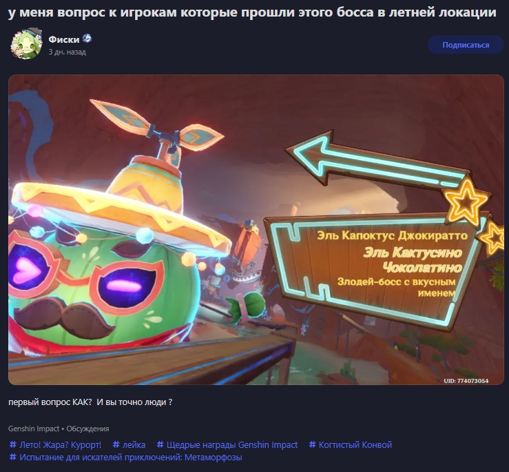 Игра сейчас на олдовичках и держится наверное... И на тех нью-чурлах по типу меня, которые вкатились в игру из-за прекрасного красочного вида лайт-фэнтези. Меня в игру привёл видос из /b/, где какая-то задорная лучница в серых шортиках и красной накидке бегала по сочной зелёной траве, стреляла из простого лука по хиличурлам, которые находились рядом со своими колхозными деревянными постройками, а также поджигала свои стрелы огнём. Там ещё на фоне какой-то замок был. Этот видос длился секунд 20 где-то, но он меня уже так зацепил, что я не мог Геншин из головы выбросить... Но что бы было, если бы я увидел, как какая-то ковбойша на летающем револьвере кружила вокруг танков посреди технического современного порта? Или если бы какая-то женщина в латексном костюме на мотоцикле кружила вокруг, блять, огромного кактуса с ручками-ножками, усами и в шляпе? Риторический вопрос, конечно же... Ляо подсадил меня на чистую бесплатную дозу первосортного товара, а сейчас, когда я уже не могу соскочить, продаёт мне разбодяженный говняк.