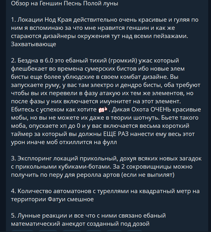И именно этим плох Натлан. Он сильно выбивается из общей гармонии. Сравнив тот же Монд и Фонтейн, разницу почувствуешь, определённо, но всё равно продолжает присутствовать некоторая целостность игры. Натлан и Монд таким же образом я сравнить не могу. И да, тут вернёмся к началу, к тому самому разнообразию. Почему же это не круто на мой взгляд? Ну потому что ты привыкаешь к другому, настраиваешься на другое. Это как начать играть в Дарксоулс, а в середине игры ГГ садится в электро кар и потом начинаются гонки... Пример грубый конечно, ведь жанр у игры не поменялся. Но вот сеттинг - да. Но дальше нас ждёт больше: Тоф Нод-Край с голографическими панелями управления и танками. Круто, чё. Зато Ляо посидел на всех стульях.... Вот только это хуйня на самом деле. На что вообще расчёт? Что новичок увидит где-то рекламу Генша с видосами из Нод-Края, возбудиться и зайдёт в игру? Дак там его будет Монд первым регионом ждать, никаких танчиков. Ну а те новички, которых наоборот заведёт средневековый антураж, они же теперь будут знать к чему пойдёт в дальнейшем игра. Они УЖЕ будут знать, что игра-то не про средневековое фэнтези нихуя, а значит и тот самый вайб они получить не смогут.