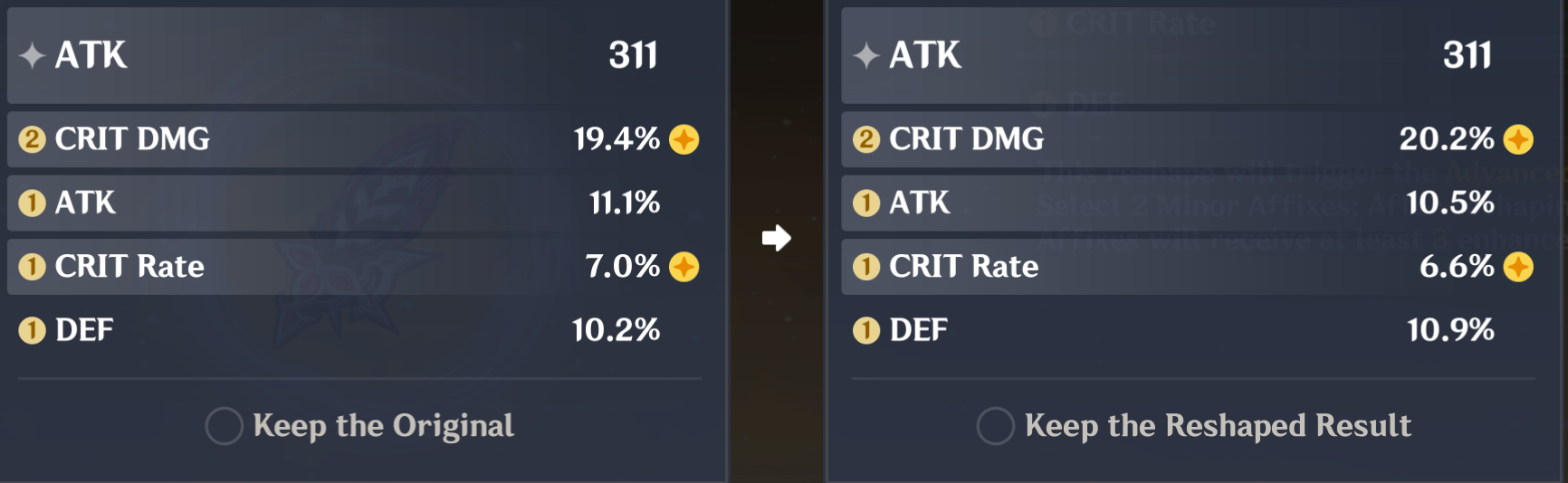 Типа надо изначально брать норм арт, но с крайне всратыми проками, то есть прям все мимо, 1000 хэпэ, 100 защиты. Но я правда такие сразу на заточку других отправляю, типа зачем хранить буквально бесполезный абсолютный мусор? Ну и вот, такой арт можно переточить и там пару проков в криты уже поднимают арт с помойки на уровень "говнище", второй раз на уровень "посредственность" и в третий "ну ок, сойдет", про перфект речи не идет конечно. А если арт изначально "ну ок, сойдет", то ничего не выйдет. И все, но типа блин, кто хранит мусорные арты, зачем? Сейчас вот есть крио кубок для Скорк и первый переточ будет такой же невнятной мусорной фигней, тут без вариантов.