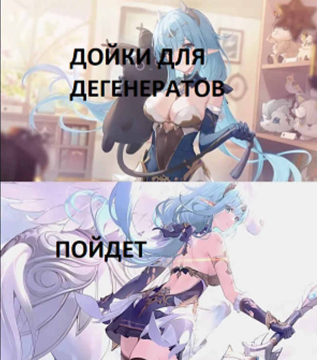 Я смотрю на эту пикчу и у меня абсолютно нулевое желание крутить кого то, а чтобы гача дрочильня завлекала надо хоть как то запариваться и делать оригинальные запоминающиеся дизайны, чтобы хотелось крутить этого чемпика Кумерство тоже надо уметь делать, эльфийки с вываливающимися жирными сиськами это говноедство, чтобы сделать персонажа сексуальным надо думать где и как что то подчеркнуть одеждой, а не просто хуйнуть пару нейротряпок на голое тело