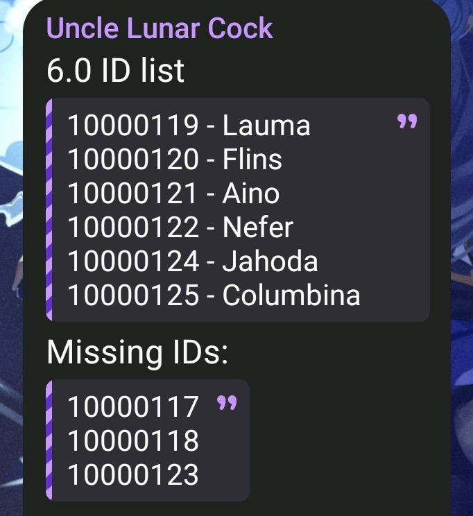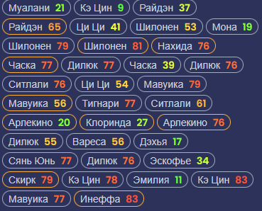 6.0 - 117 и 118 это персонажи из нового UGC режима, Лаума, Флинс и Айно - соответсвенно под номером 119, 120 и 121 6.1 - Нефер 122 6.2 - Линея четверка под номером 123 и Ягода 124 6.3 - Коломбина 125