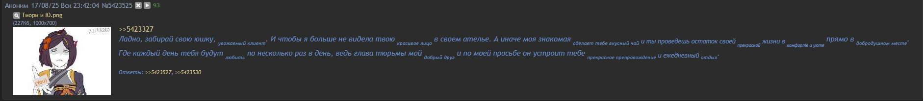 >>5423327 Ладно, забирай свою юшку, увожаемый клиент. И чтобы я больше не видела твою красивое лицо в своем ателье. А иначе моя знакомая сделает тебе вкусный чай и ты проведешь остаток своей прекрасной жизни в комфорте и уюте прямо в добродушном месте. Где каждый день тебя будут любить по несколько раз в день, ведь глава тюрьмы мой добрый друг и по моей просьбе он устроит тебе прекрасное препровождение и ежедневный отдых. Допивай свой чай с молоком и уходите из моего ателье.