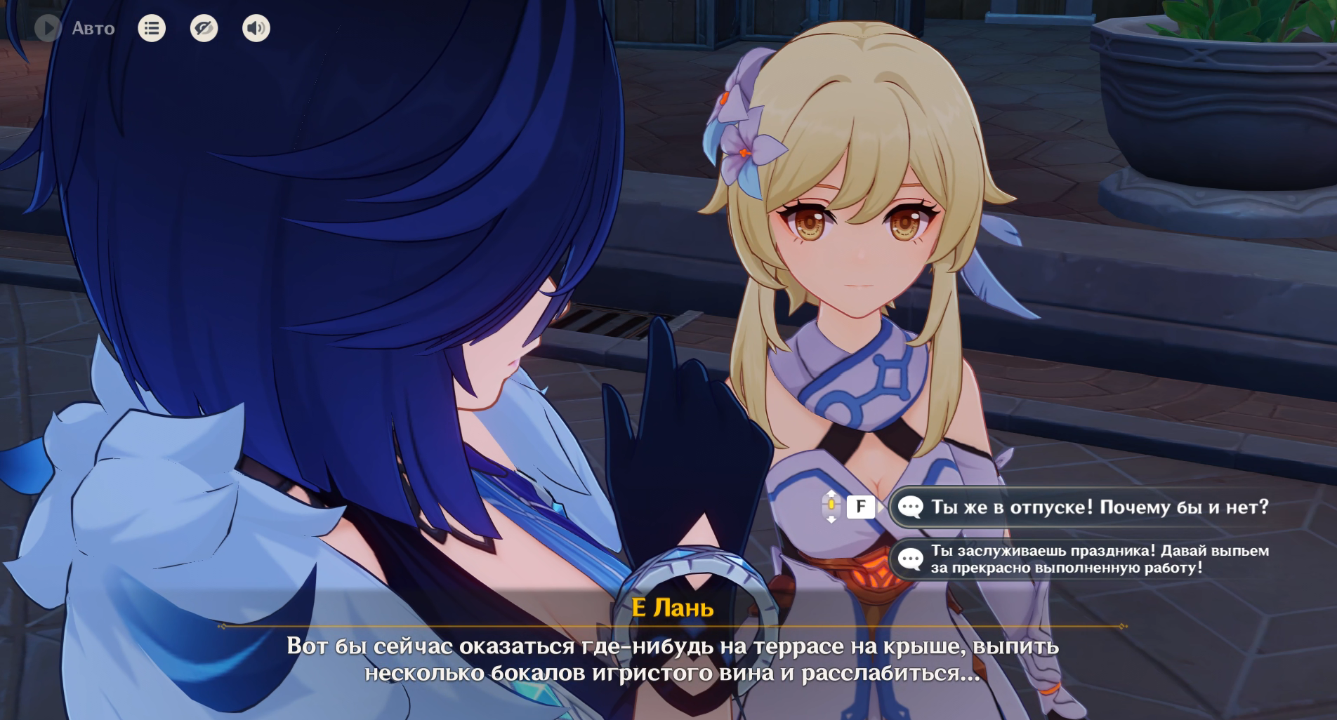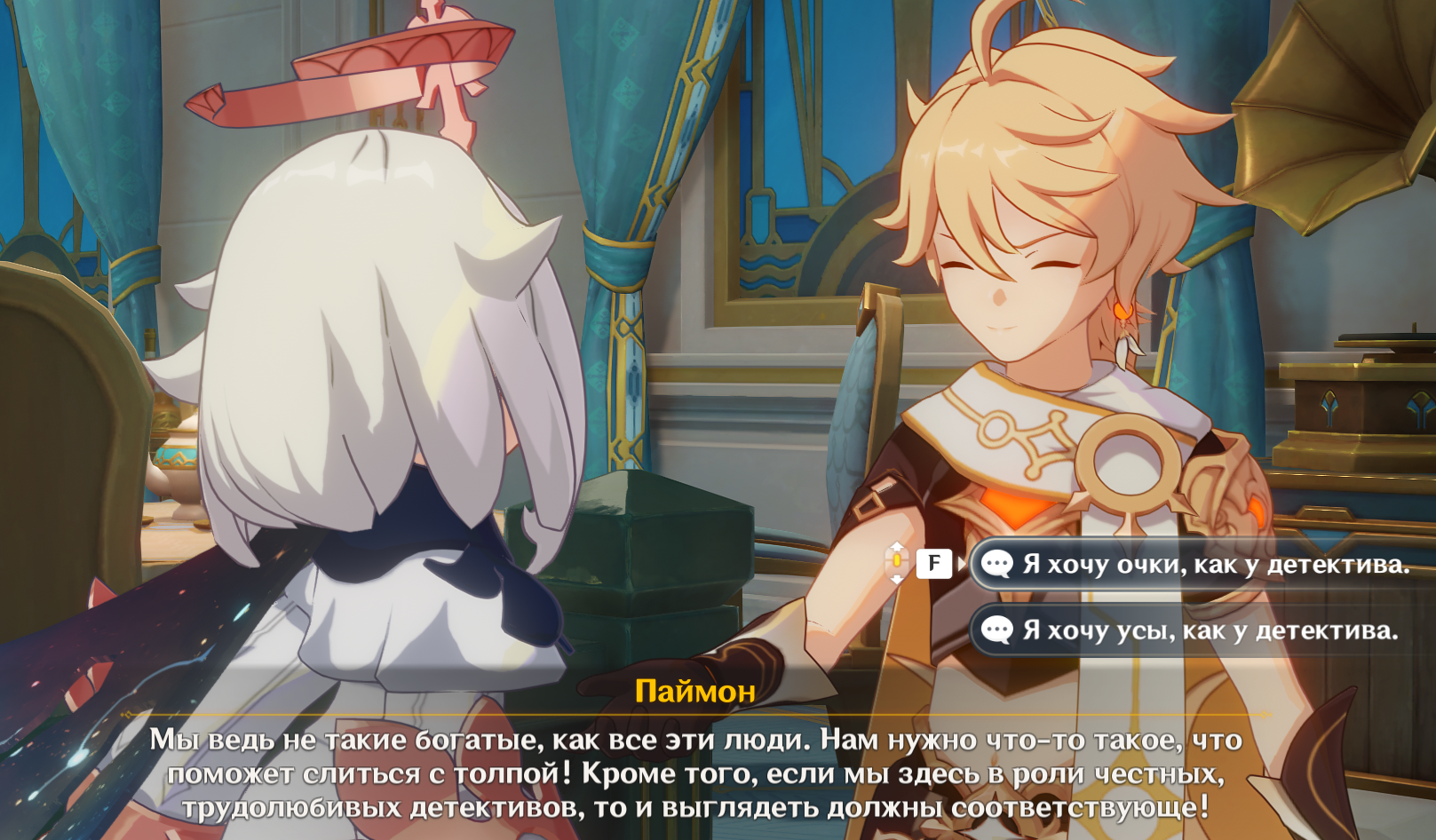 Моя Люмин должна учиться на своих ошибках. Совсем недавно она в Фонтейне выпила эликсир какого-то похитителя сокровищ и её заперли в бочке. Надеюсь она это помнит и нажав второй вариант диалога не станет пить сомнительную бурду от сомнительных личностей.