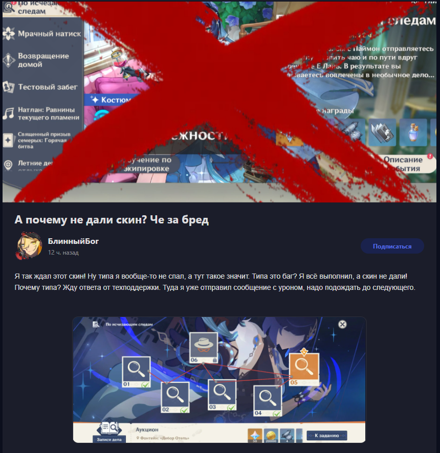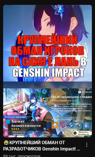 >>5426701 Мне друг ирл который тоже играет в Геншин недавно сказал "Ну хоть скин за Елань дадут" Я говорю "В каком смысле?" А он "ну там ивент с ней появился на скин, чет в этот раз хуеверс расщедрились, и скин на Беннета и на Елань" Я спрашиваю "И где ты это вычитал?" А он говорит, что ему другой знакомый ВК, который играет в Геншин написал, что будет бесплатный скин на Елань