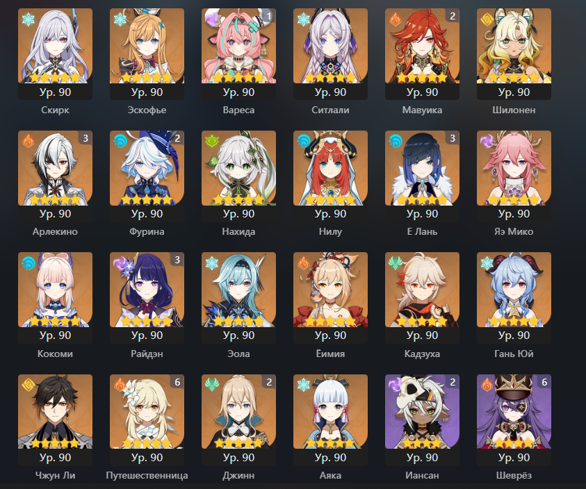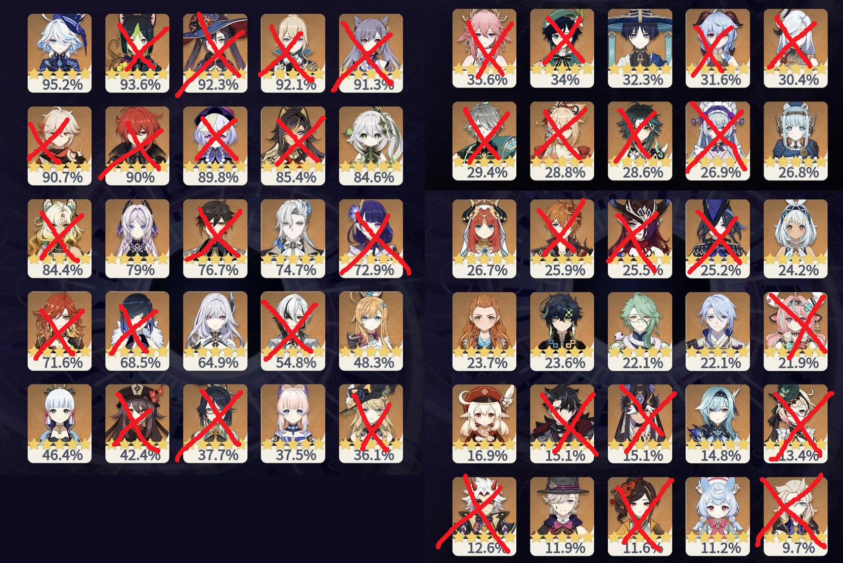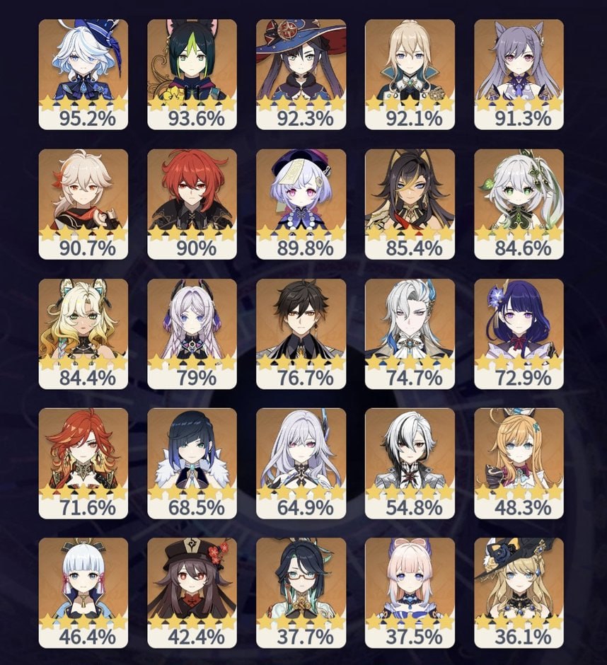 Процент наличия персонажей на 120 тысячах аккаунтах Фурина настолько мастхэв персонаж, что по наличию она превосходит всех стандартных персонажей 👀 В топ-6 после стандарток идут Кадзуха, Нахида, Шилонен, Ситлали и Чжун Ли — все саппорты. ДД персонажи процентарно ниже саппортов, но в топе Невиллет, Райдэн, Мявуика, Скирк, Арлекино.