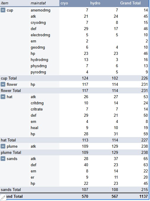 > Это тупейший гринд говна, который тебе даже ничего не гарантирует. Не гарантирует, но на длинной дистанции вероятности мейнстатов выравниваются. Как в моем случае даже разброс гидро-крио артов оказался близок к 50:50, и шапок с критами достаточно нападало. Это уже в сабстатах и апгрейдах будет скам, но теперь перья могут рероллить апгрейды.