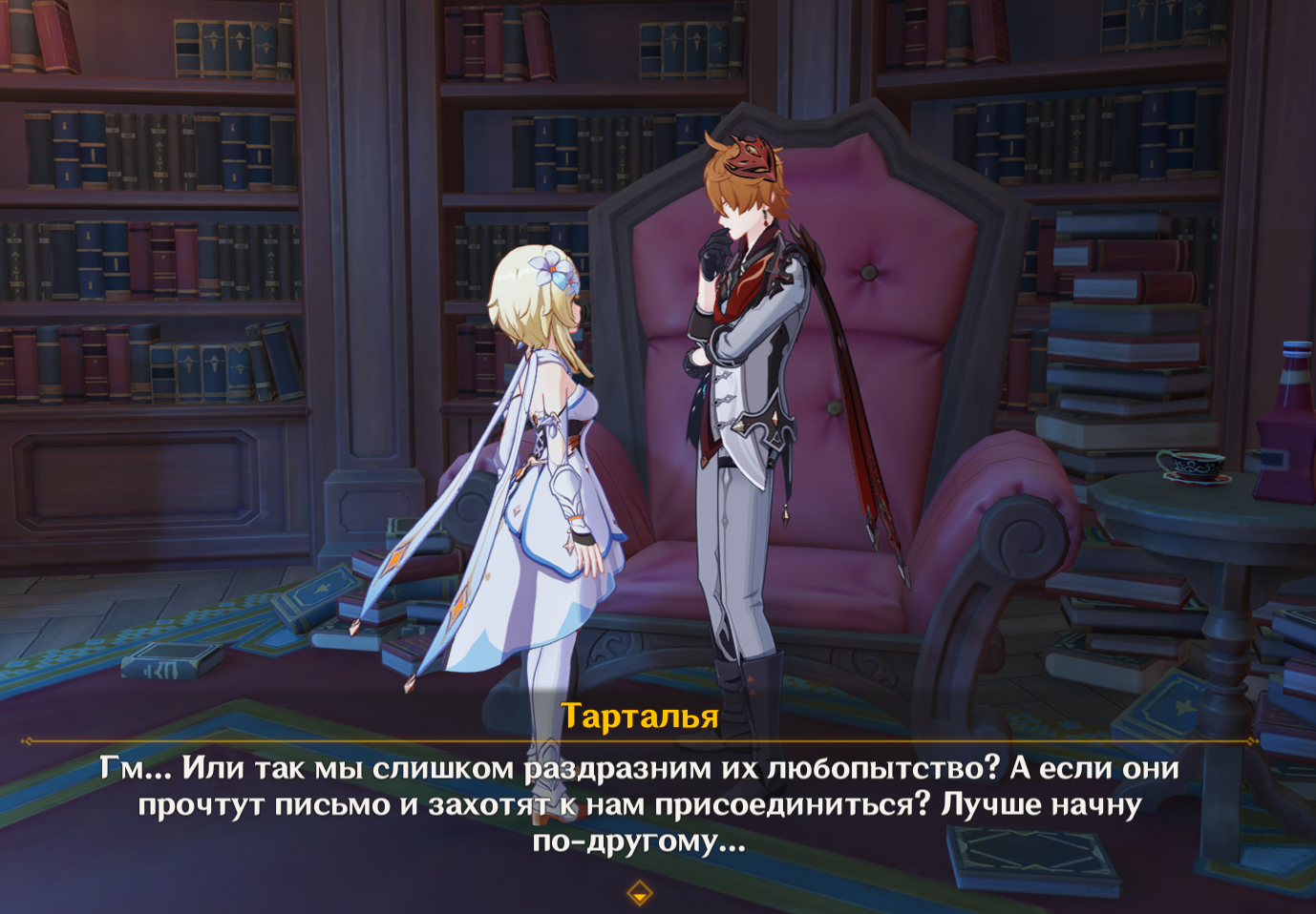 или вот Фишль: Не разглядеть правды, не разобрать судьбу, из лжи и истины выткан гобелен его речей... Возможно, этот человек, как и я, несёт бремя видения сквозь судьбы... Оз: А может, он и правда пират?