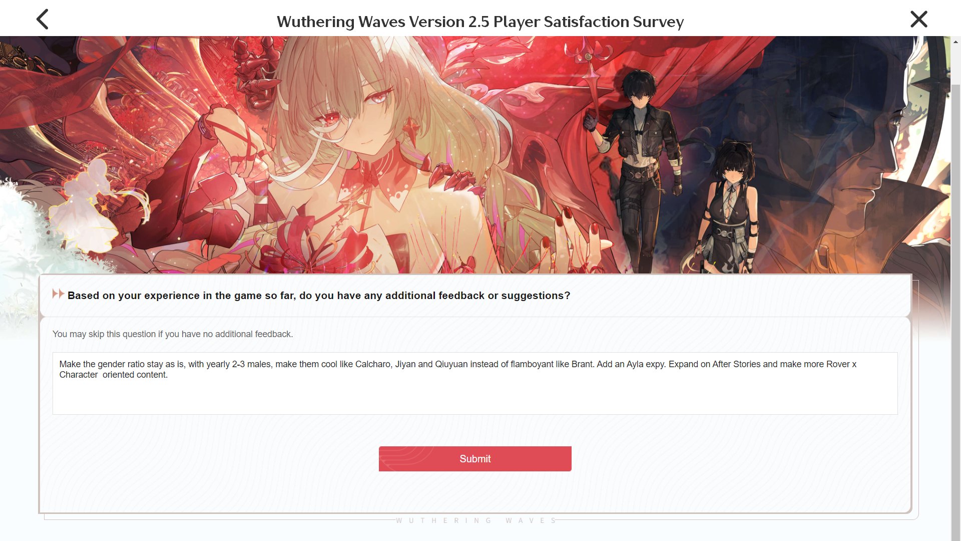 · Weekly Boss materials conversion · Add room with damage testing dummy · Add pulls counter on convene menu · Add more language localizations · Add a function to view details of friends' characters · Increase amount of tuner rewards in "Tacet Fields" and "Fantasies of the Thousand Gateways" on UL 60, UL 70 and UL 80 · Add a separate activity that allows you to spend waveplates ONLY for tuners · Add opportunity to choose region for daily quests · Make Kurobbs available for global · Increase limit for friends · Increase reward claim attempts for weekly bosses · Ability to farm echo on weekly challenge bosses in co-op · Add option to turn off/on resonanse chains on characters · Remove pop-up message in Tower of Adversity after restart · Priority for leveling up talents for resonators, based on in-game player statistics · Ability to revert purification in synthesis menu · Ability to track several types of echo on the world map, not just one · More slots for echo presets · Add endless combat endgame mode · Add more co-op events · Increase daily limit of TDs in Nightmare Nests · Add Tacet Field with Nightmare Tacet Discords · Remove unobtainable sigils from 1.0 version · Add all new Ascension Materials in merchant stores · Add archive of records in ToA · Add friends records in ToA and WhiWa · Do not update Dreaming Deep or fully rework them · Add more Previous Records for Infinite Feats, not only last reset · Fix "Guide Depot", it contains a lot of misleading information · Link echo presets to team presets · Fix bug in WhiWa where you cannot change resonator weapons and echoes after quitting from stage · Increase echo limit in Backpack