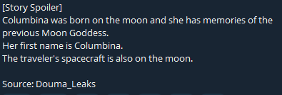 [Спойлер истории] Колумбина родилась на Луне, и у неё есть воспоминания о предыдущей Луной Богине. Её первое имя — Колумбина. Космический корабль путешественника тоже находится на Луне.