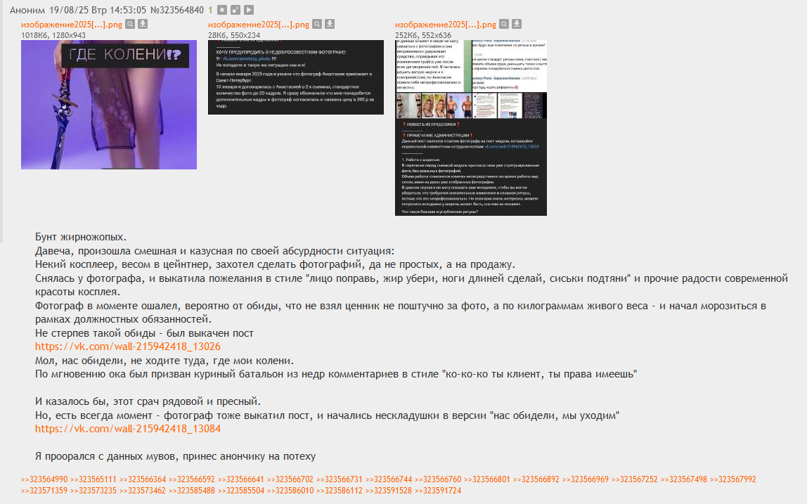 >>5431754 А в чем прикол. Это реально смешно должно быть? Просто заметила, что у вас про тянок лишь одна шутка, типо они жирные. Я не жирная, и все мои знакомые подруги играющие в гачакал тоже не жирные. Не понятно, на чем обосновано такое.