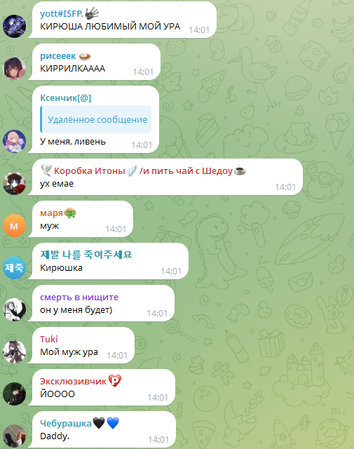 даже торт который типо евил фатуй на самом деле любит свою семью и просто тренируется орешек должна была быть месугаки но на самом деле прикалывается и добрая дыня на самом деле нивинавата это безликие модельки фатуев куклу задурили а она хорошая и любить данго молотько