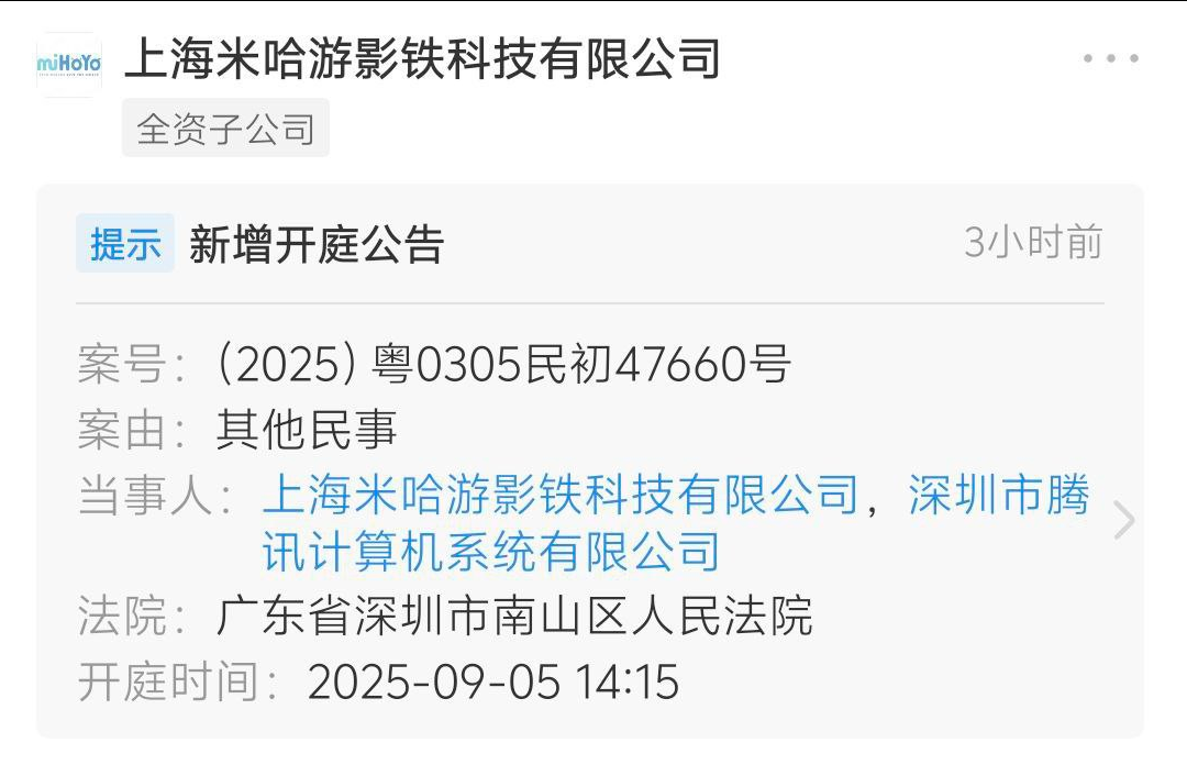 > это официальное объявление о судебном заседании между mihoyo и tencent, назначенном на 5 сентября. Речь идет о "других гражданских делах" (не уточняется, но обычно подразумевается спор о контрактах, правах интеллектуальной собственности, соглашениях о сотрудничестве или аналогичных вопросах).