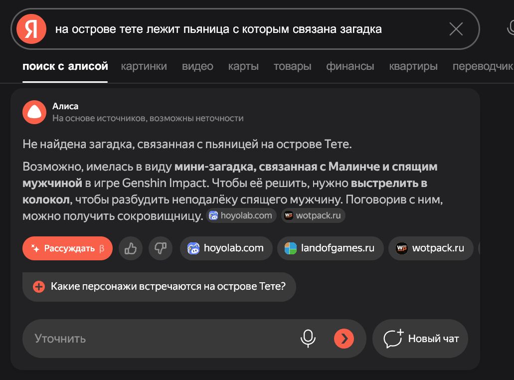 Итак, по новому лору Алиса у нас альфа самка. Нечаянно при готовке спалила одно крыло Саре. Много раз доводила до слез Яэ Мико. Шесть раз булила Аяку предложением сделать из нее айдола. Пыталась подьебать сёгуна целых ноль раз.