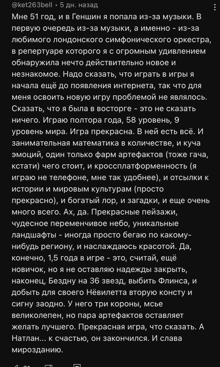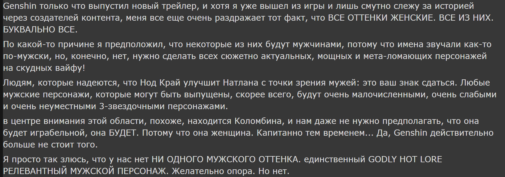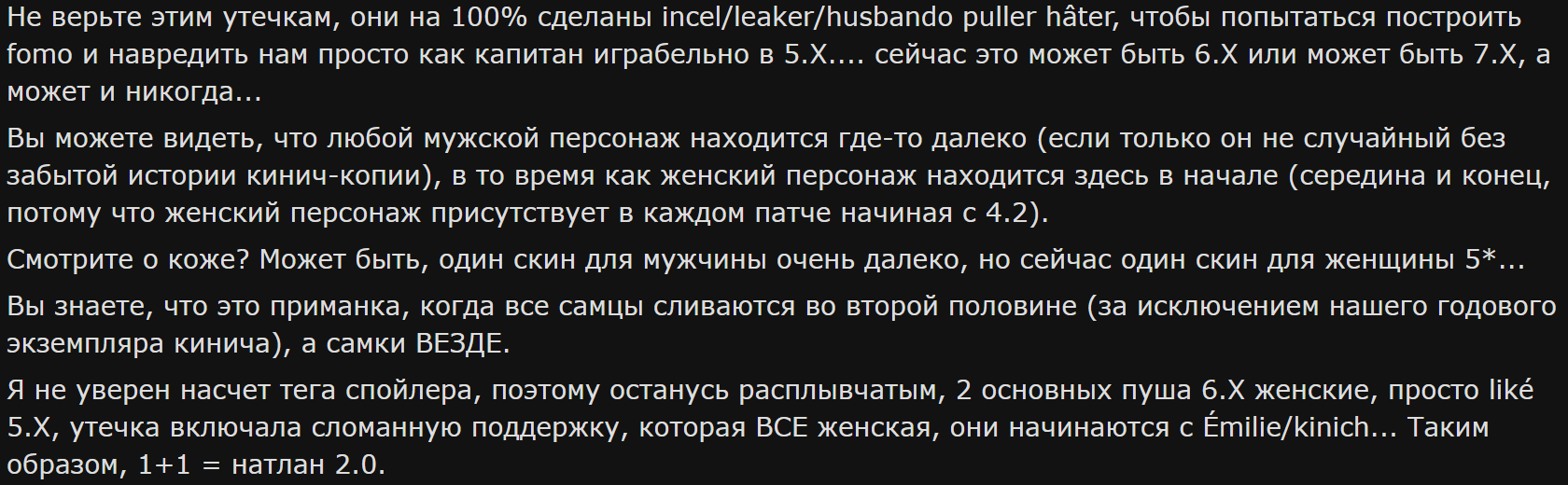 Также, возвращаясь к демонстрации игры на крупной игровой выставке. С учётом крупных и громких релизов (которых не было), а так же с учётом демонстрации трейлеров более "базовых" игр от "базированных" китайцев с сексуальными женщинами и без повесточки (проходной кал для вырожденцев), Давей бы не смог показать трейлер женского персонажа Лаумы такого же уровня, чтобы базовички-инцелы смогли написать об этом в своих соцсетях и порадоваться тому, как очистились игры и как базированы китайцы. Ведь игра Геншин Импакт создана не для удовлетворения кумерских фантазий подвальных жителей, а для прекрасного времяпрепровождения игроков разных возрастов и полов, фэмели френдли игра.