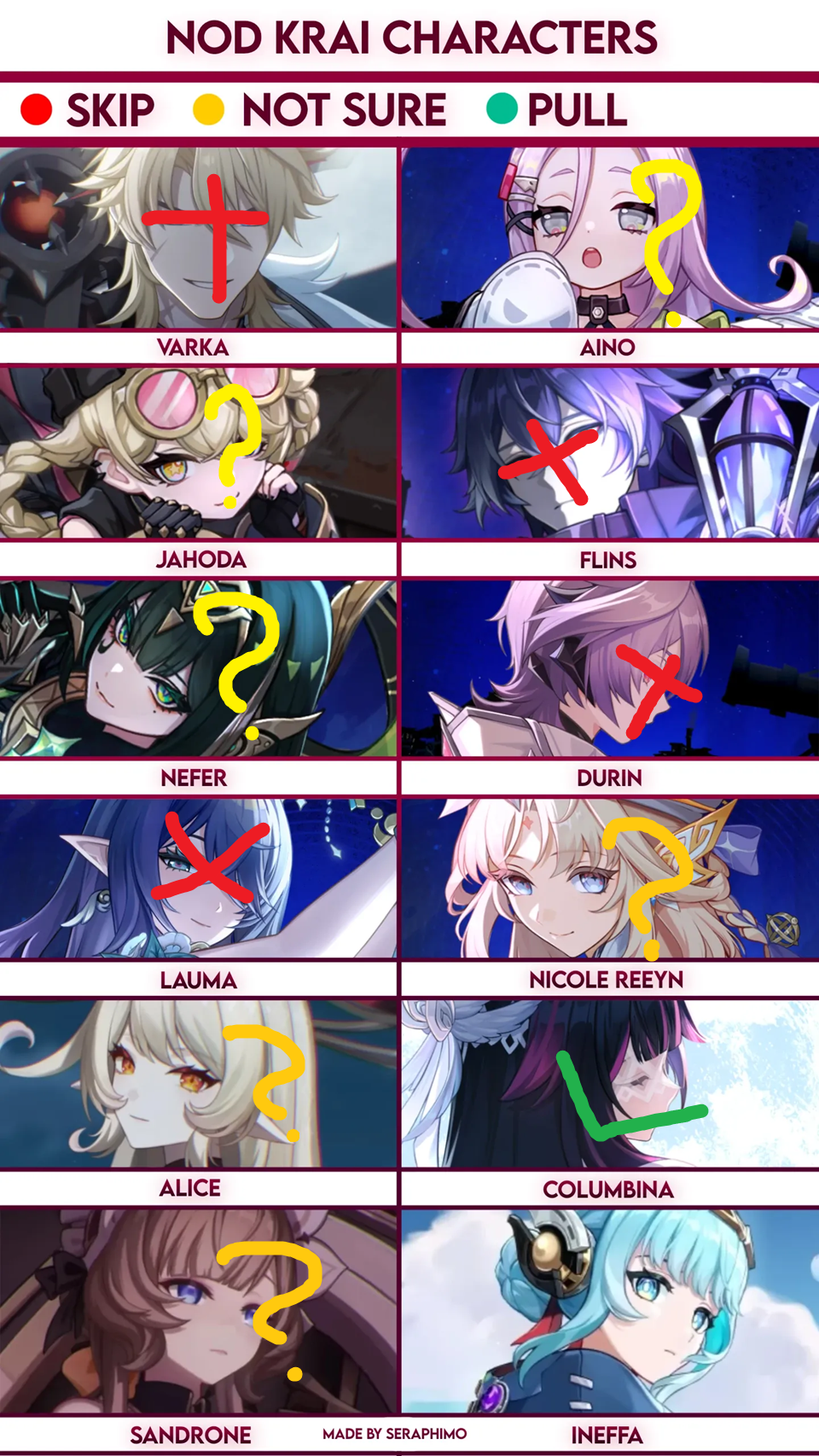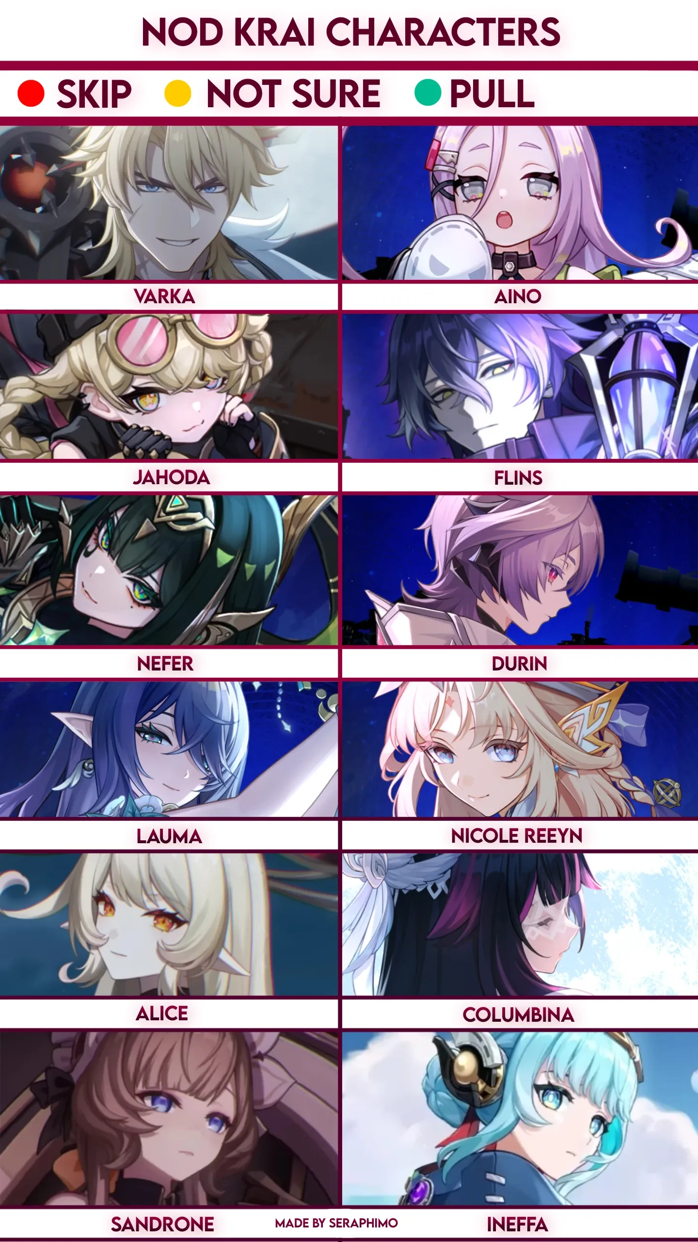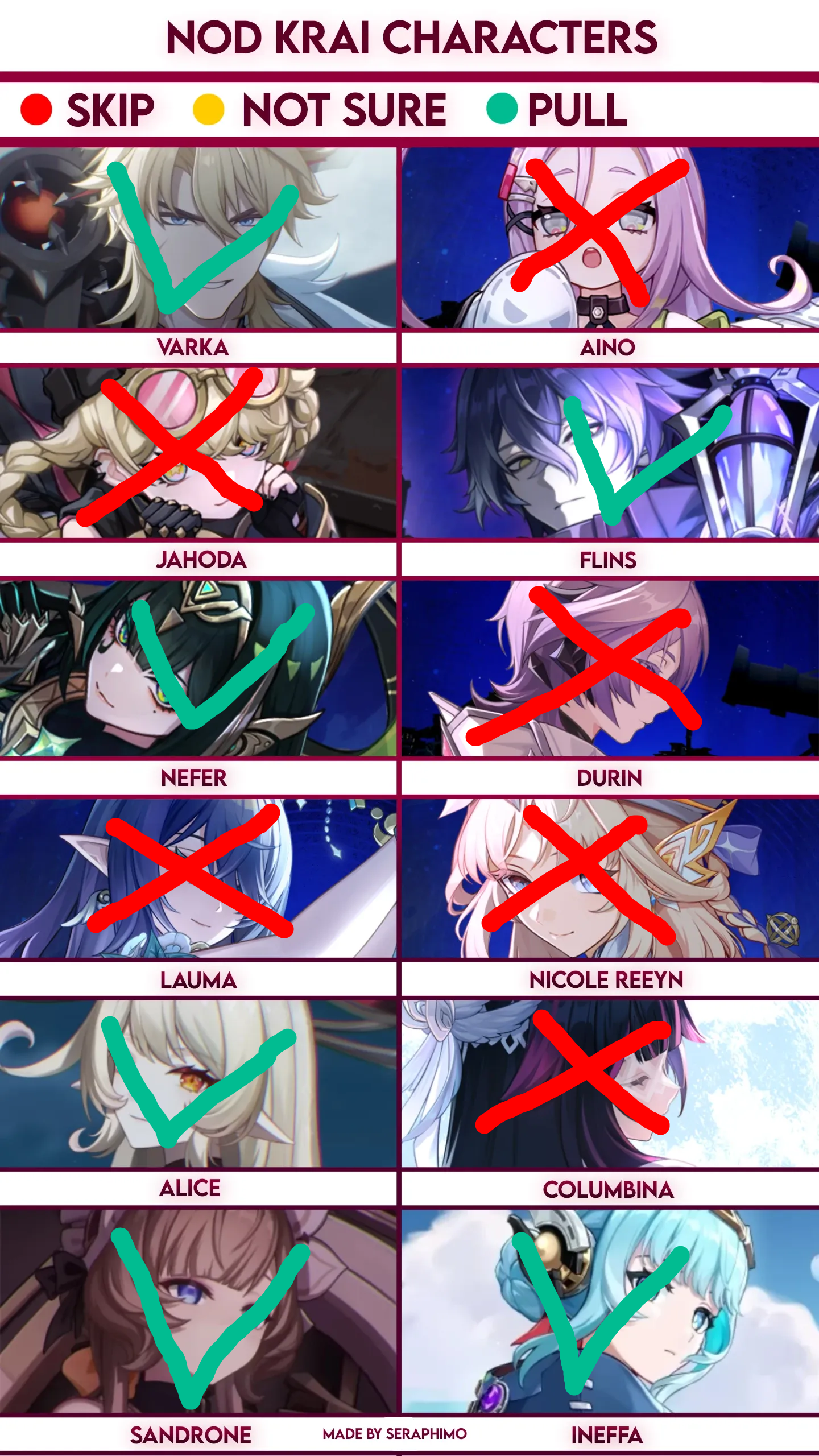 1. Мондштадт - Джинн или Эола 2. ЛиЮэ - КэЦин или Елань 3. Инадзума - Эи или Аяка 4. Сумеру - Нилу или Дэхья 5. Фонтейн - Клоринда или Навия 6. Натлан - Часка или Ситлали 7. Вжушккрай - Коломбина или Алиса