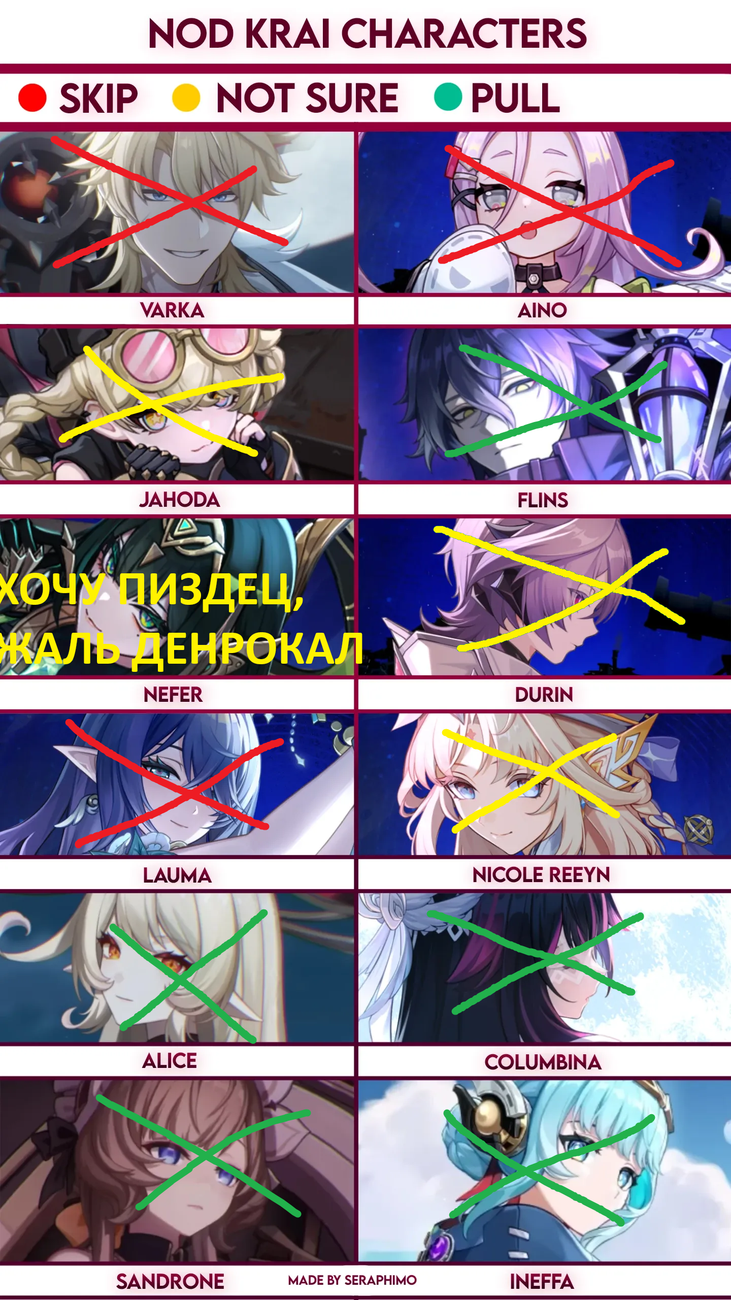 Протухнут, в том-то и дело. Из этих всех разве что Нилу бы выкрутил, но и то, арбузы-то даванули и уже давно, не особо актуально это все, так что если прям волна реранов, то выкрутил бы, а вперемешку с новыми придется отдавать предпочтение новым, тем более там снова вайфы, а не парад сосисонов. Остальные строго нафиг, гео всякие, Сижки и так далее, все это уже несерьезно, для души есть крио и электро дуры, пока что этого хватает. Энивей, Инеффу таки выкрутил, эх, потратил последнюю удачу на это, вин стрик из 4 подряд вряд ли будет, тут без вариантов. А значит придется душиться линией из 3 проигрышей подряд.