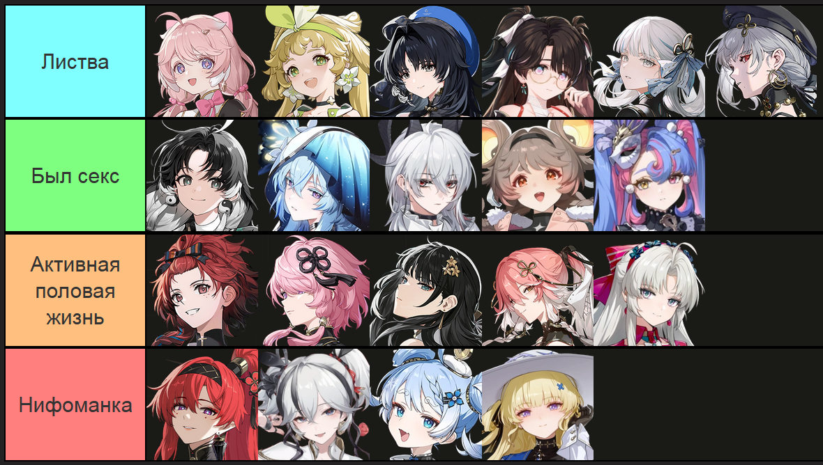 >>5225598 Я скипал 1.2, отдыхал от гач в целом (из-за учебы). Поэтому нет ни Жежи (выроллена на реране), ни Яовичка. Сам играю с 1.1. >Это как? Примерно так.