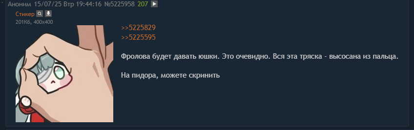 >>5225595 По началу хотел, чтоб Фролова была обособленным персонажем, злюкой без юшек и без отбеленного ануса, но после свидетельства жиpушных постов решил, что закид юшек не так уж и плох, если это растопит еще хоть парочку жиpовых големов.