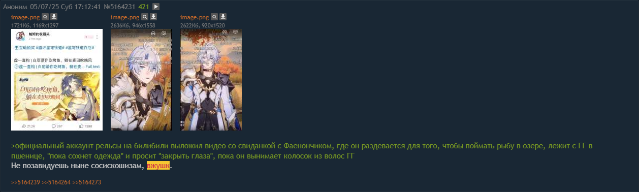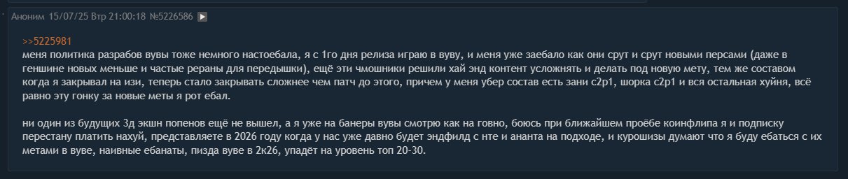 А так, Фролову я все же ждал долго и то, что из нее могут сделать кость для паймон (а сейчас вся эта аудитория буквально ссытся оттого, что Фролова там Ровера скамит в войслайнах на днюху) меня может прям добить. Хотелось бы верить в Писевора, тем более, что в ПГРе он только сильнее долбит соевичков и хуярит по два свадебных скина в патч. Но то ПГР. Как будет в вуве все еще неясно...