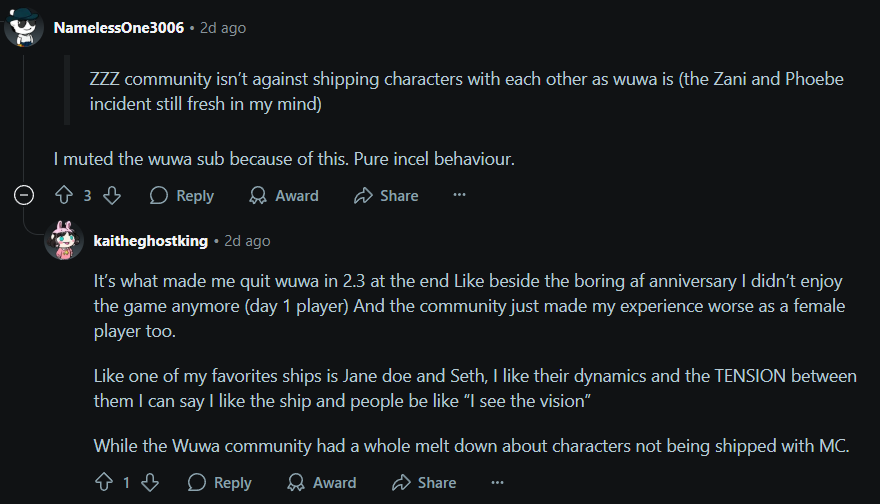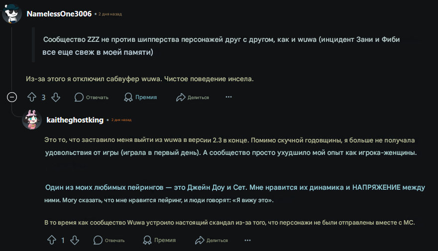 Wuthering Waves мог бы быть отличной игрой и конкурировать с Genshin и HSR, но разработчики выбрали этот дурацкий гаремный путь, который почти никому из игроков не нравится. А те, кому нравится, ведут себя крайне грубо, стоит только предложить что-то иное. Я почти уверена, что обычные игроки уже УСТАЛИ от того, что все женские персонажи постоянно влюбляются в Ровера. Это начинает утомлять. Один и тот же скучный сюжет: персонажи что-то делают — женский персонаж влюбляется в Ровера. Это больше не оригинально. Да, равенство было бы неплохо, если бы и мужские персонажи проявляли чувства, но с таким уровнем сценария это было бы ужасно. Почти нет фан-арта от девушек или квир-аудитории, потому что большинство уже ушло. И мне искренне жаль тех, кто ещё остаётся в этом фандоме. Вы помните, как Kuro пытались рекламировать WuWa на почти полностью женском ивенте в Китае и получили шквал критики в комментариях? Эта игра очень не любима женской аудиторией в Китае, потому что разработчики их полностью игнорируют. Удивительно, насколько грубой к своим фанатам может быть игра.