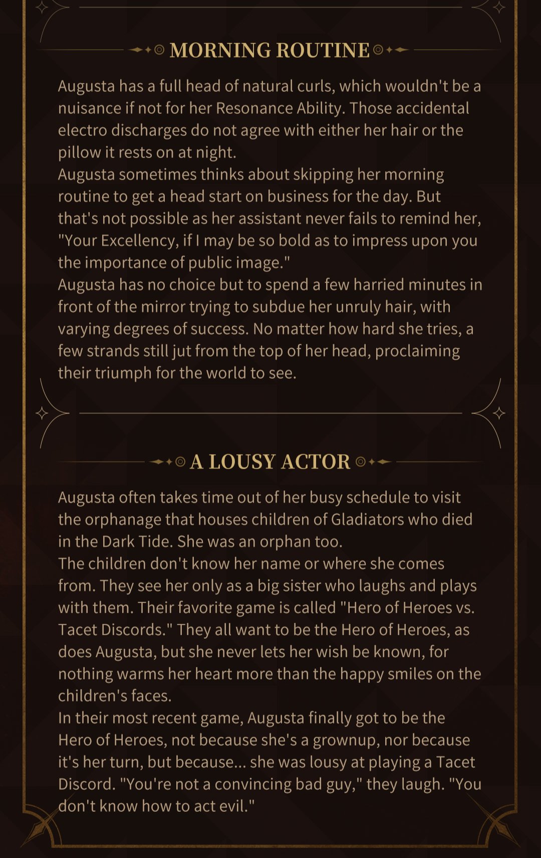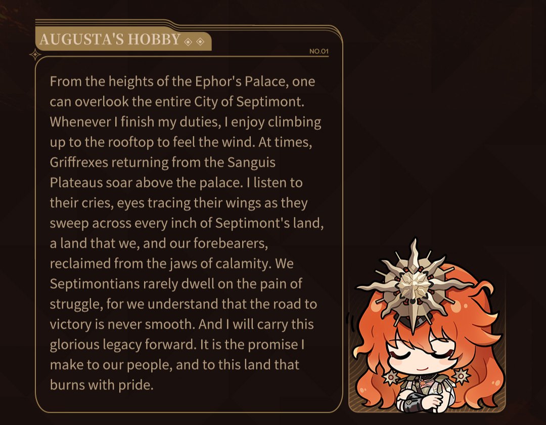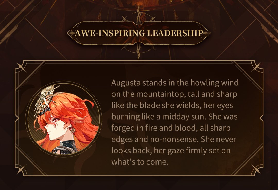 Я Августа, Эфор Септимонта. Запомни это имя — оно принадлежит той, кто возвышается над всеми, и чей след никогда не сотрется. Враги мы или союзники, мой меч и я жаждем яростного боя с тобой!