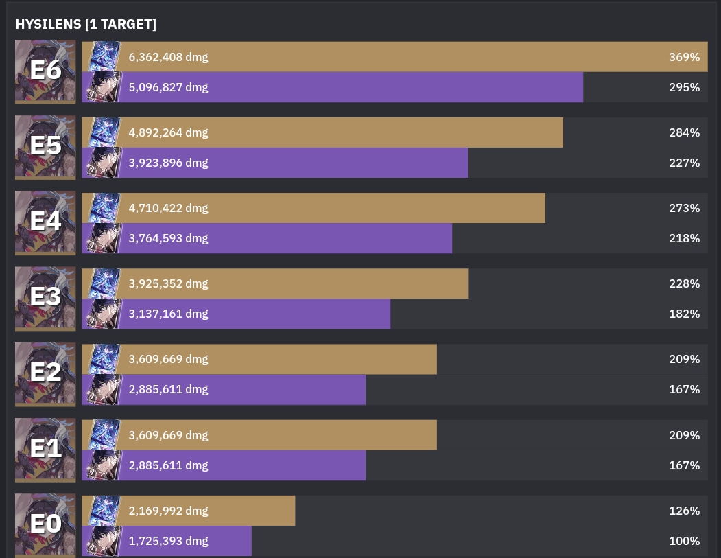У Гисиленсы прирост урона на е1 и е6 почти одинаковый кроме 5 таргетов(70-75% прирост урона),на ранних бетах нынешний е1 был вроде на е4 или е6,а у е6 был другой эффект,но в последних версиях его вставили в е1.