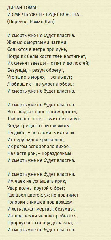 > И смерть уже не будет властна. > Стихотворение вдохновлено библейским отрывком из Послания апостола Павла к Римлянам: «Христос, восстав из мёртвых, уже не умирает, смерть не имеет над ним власти». Близнецам необходимо как либо умерет или реинкарнировать их смерть не будет являться настоящей СМЕРТЬ ЭТО НАЧАЛО ЖИЗНИ, ДРУГОЙ ЖИЗНИ