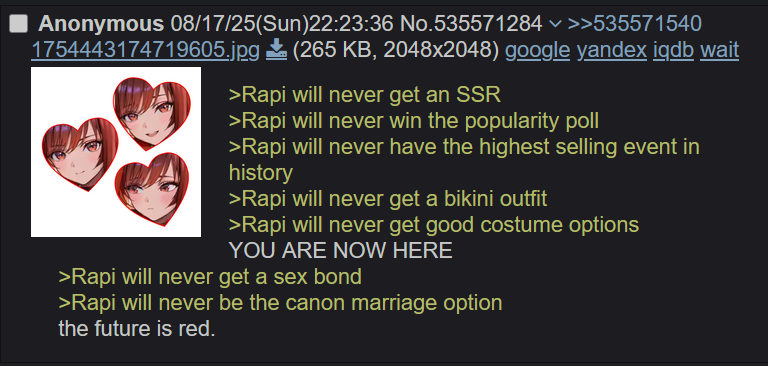 >>5468089 Вообще похоже на EH >>5468090 Нет, он прав. Рапи от хуилы выглядела как размалеванная кукла. А должна быть скромнее, чтобы не выбиваться из образа стесняши