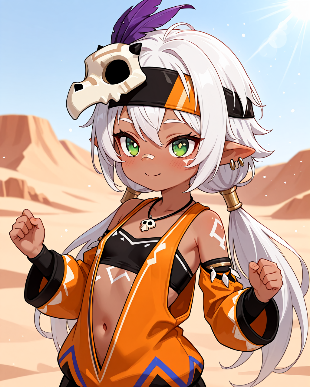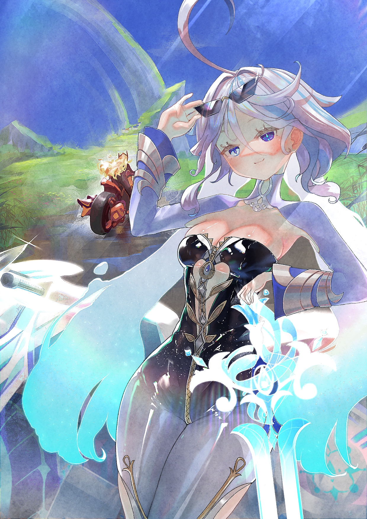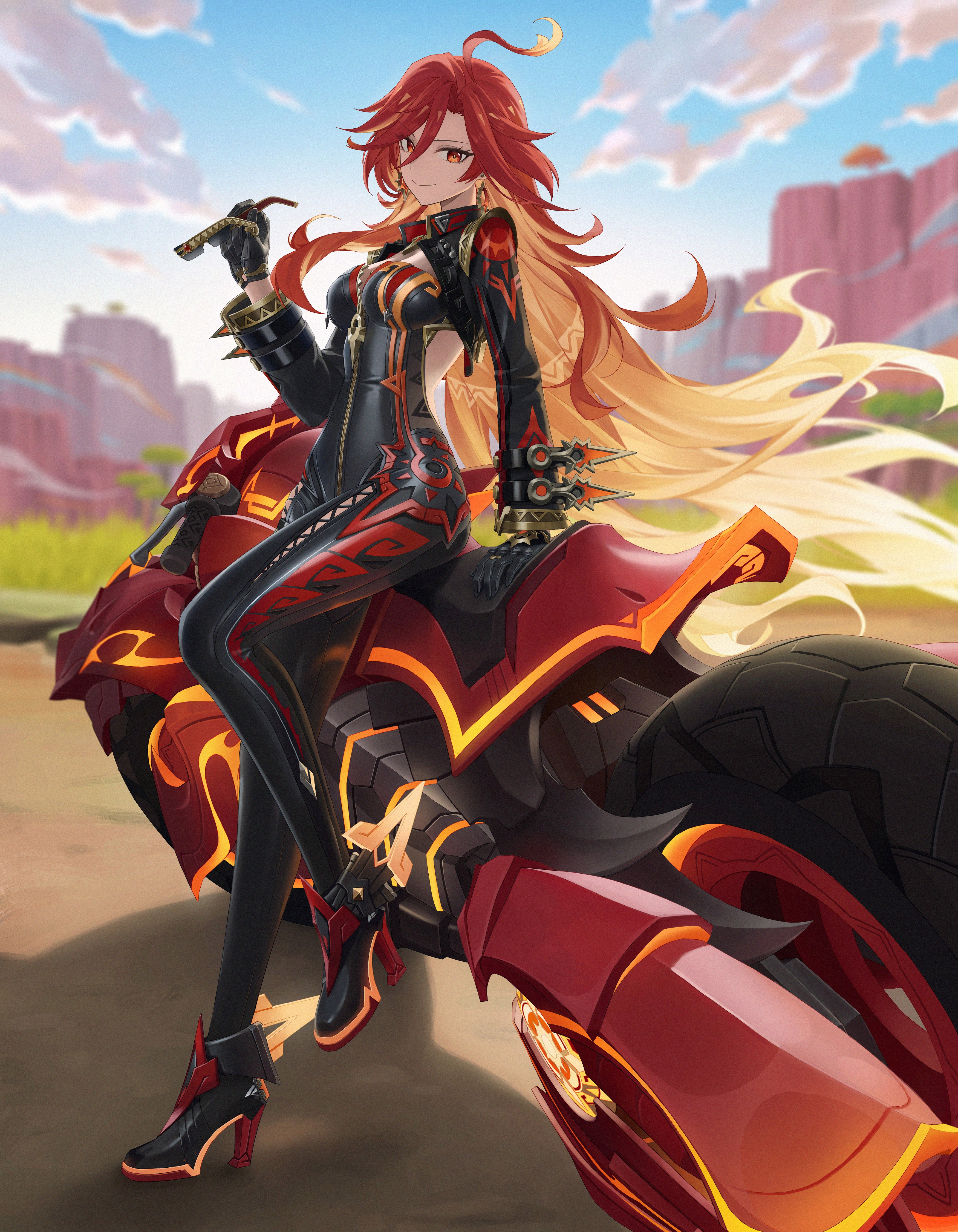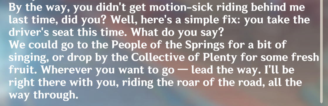☀️ Заставила ждать? Прям под палящим солнцем... Почему бы не подождать где-нибудь в тени? 🧉 Держи, выпей холодненького. Должно помочь справиться с жарой. Кстати, давненько я не наведывалась к Потомкам Крон. 🏍️ Эти малыши тогда ещё были яйцами заврианов, а теперь прыгают ко мне на пламецикл, будто хозяева! Ха!