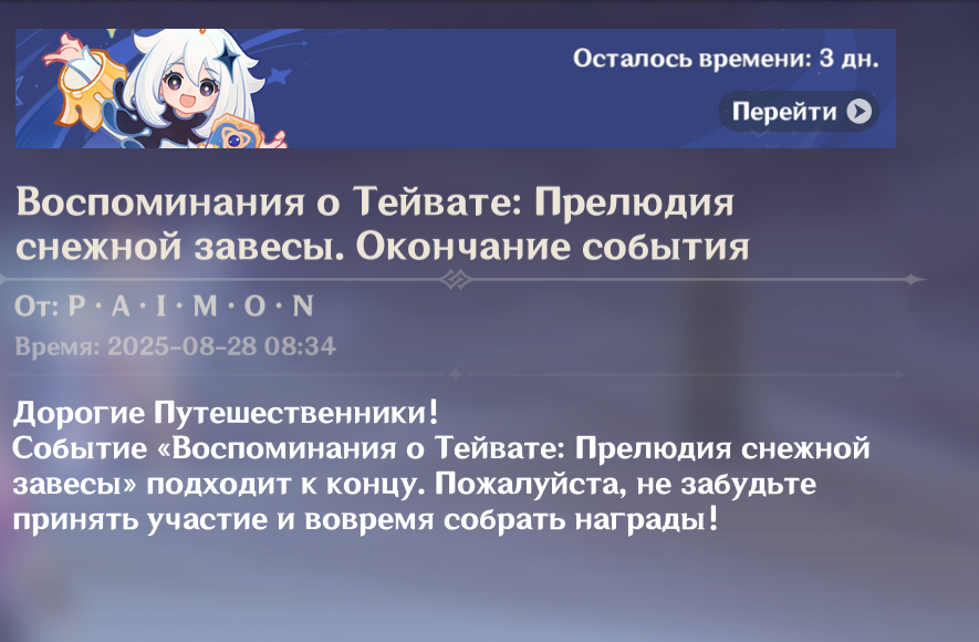 Если хочется отдохнуть от гавниша: Если завтра зайти в игру и потом выдержать 14 дней (вернуться 11 сентября), можно триггернуть эту штуку https://genshin-impact.fandom.com/wiki/Stellar_Reunion, успев при этом забрать все гемы за компенсацию