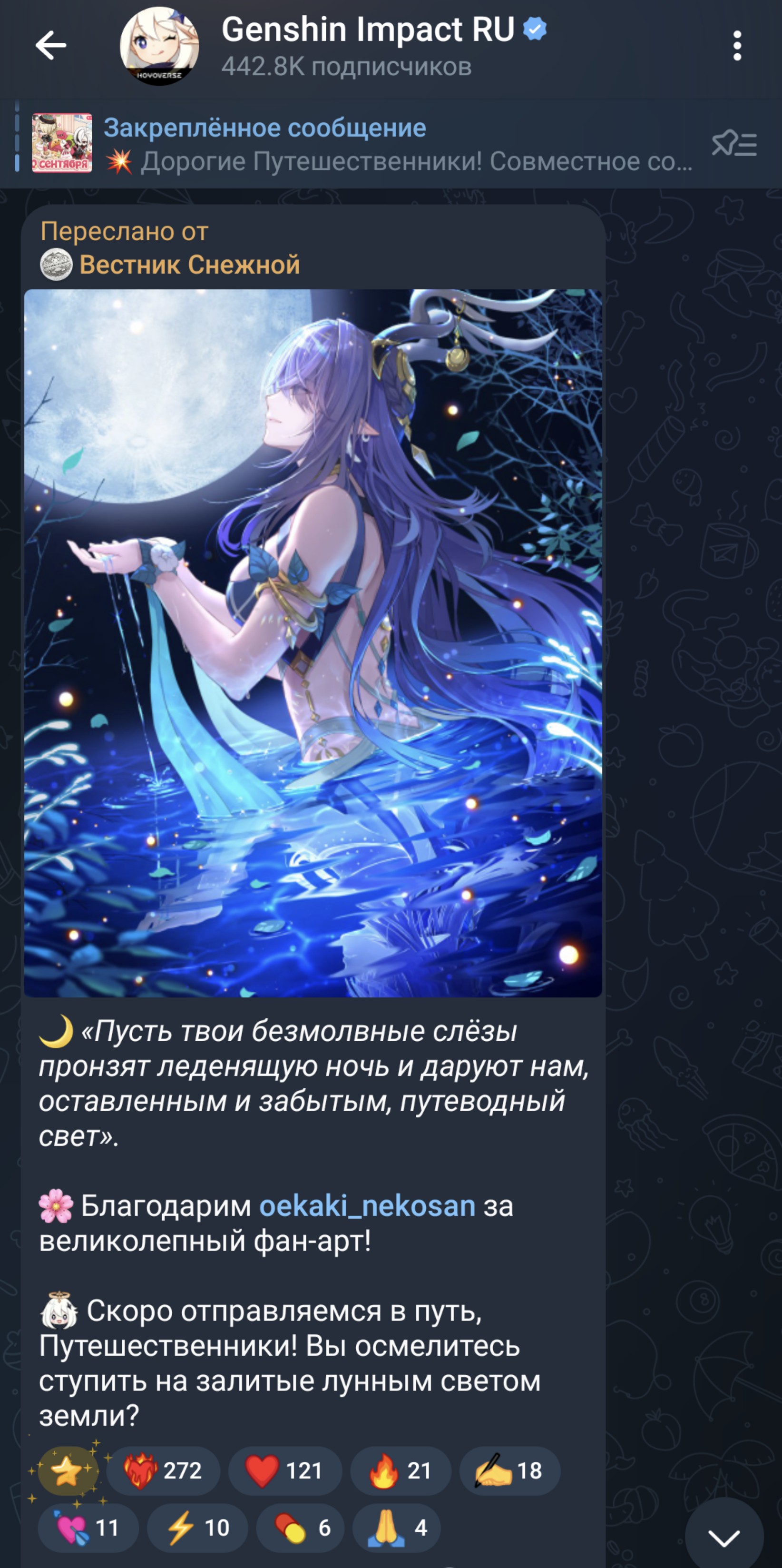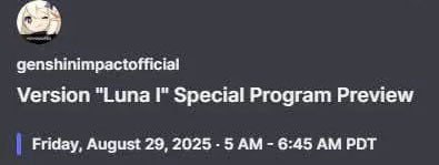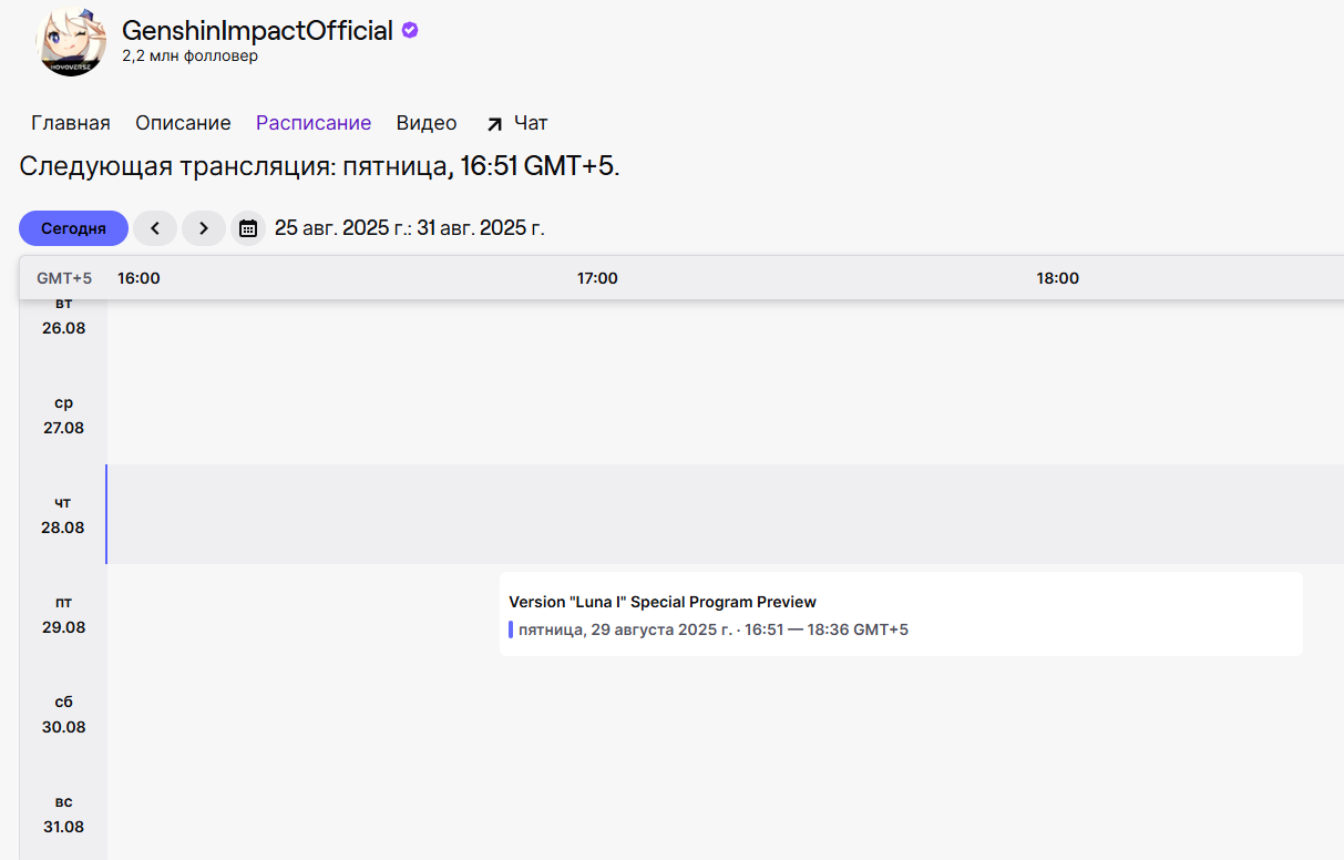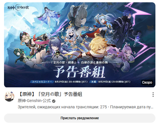 📺 Дорогие Путешественники! Пришла пора стрима! Трансляция специального стрима новой версии Genshin Impact начнётся 29.08.2025 14:51 (UTC+3) на официальных каналах на Twitch и YouTube! Стрим будет состоять из основной части с командой разработчиков Genshin Impact и отдельного блока с участием приглашённых гостей. 🔸 Twitch: https://www.twitch.tv/genshinimpactofficial/schedule 🔸 YouTube: https://www.youtube.com/@GenshinImpact ✨ Из этого стрима вы узнаете подробности сюжета и другие интересные факты о новой версии. Вас также ждут промокоды и другие щедрые награды! Следите за нашими каналами. Скоро увидимся, Путешественники! ※ Основная часть стрима версии «Песня полой луны» начнётся 29.08.2025 15:00 (UTC+3). Блок с приглашёнными гостями выйдет до и после основной программы. Следите за новостями!